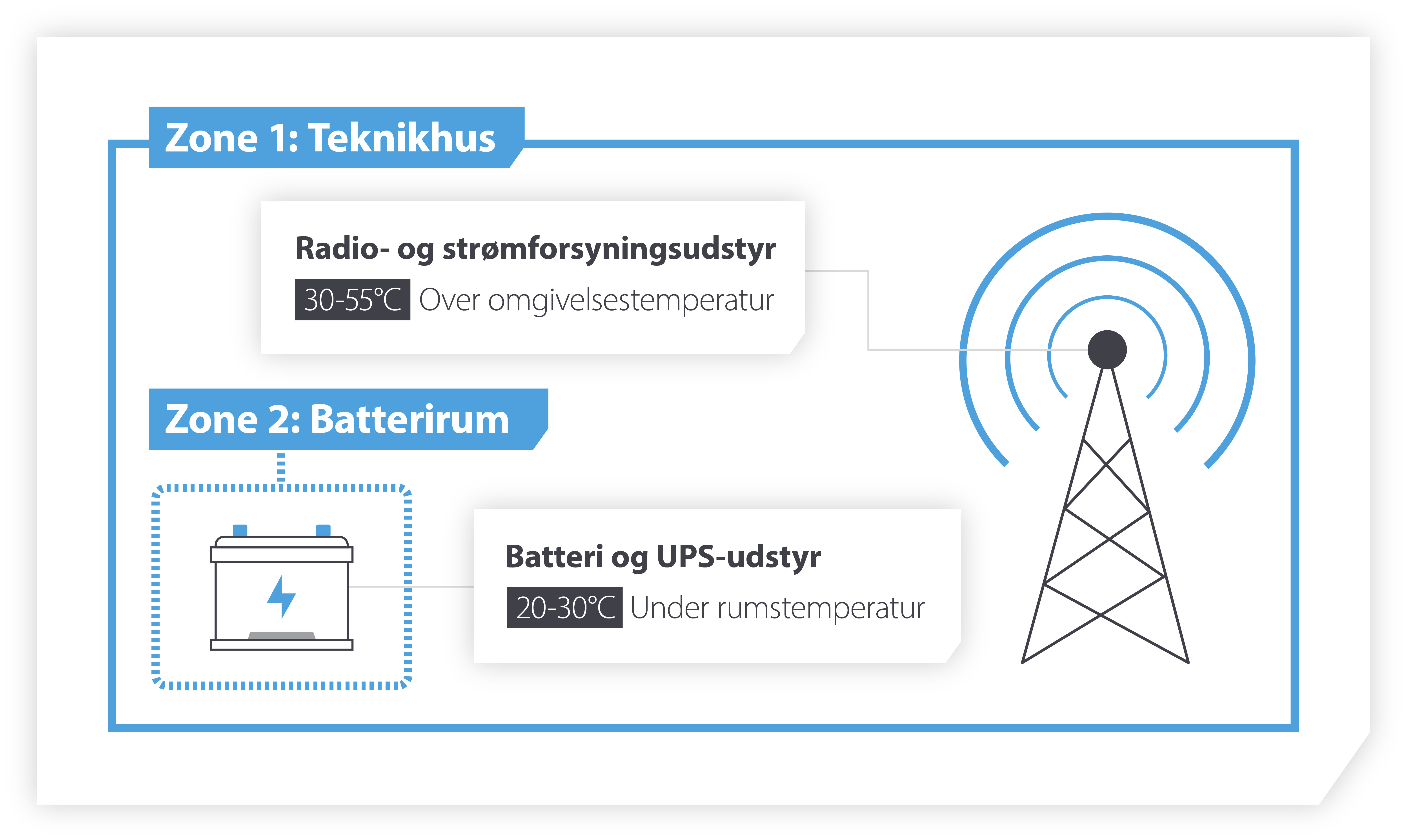 Ved hjælp af en specialbygget isoleret kasse isolerede vi batterierne fra radiotransmissionsudstyret for at muliggøre separat køling i to zoner i samme rum.