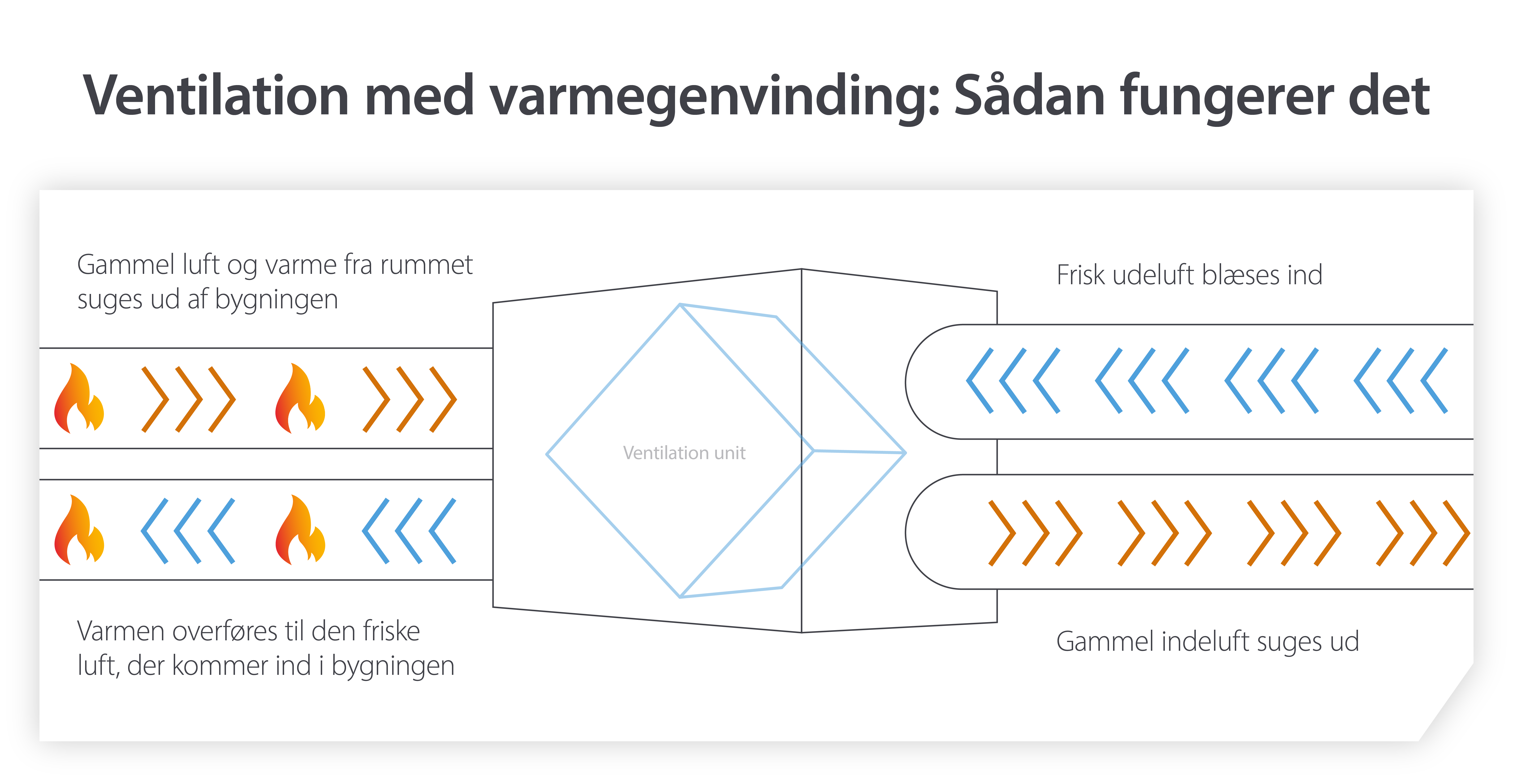 Varmegenvinding fungerer præcis som det lyder – den varme, der allerede findes i et rum, genvindes og genbruges, og derved reduceres behovet for at tilføre mere varme til rummet ved at forbruge energi. I stedet for at varm, stillestående luft slipper ud af bygningen og kold, frisk luft kommer ind i den, overføres varmeenergien fra den ene luftstrøm til den anden for at hjælpe med at opretholde en jævn temperatur indendøre.