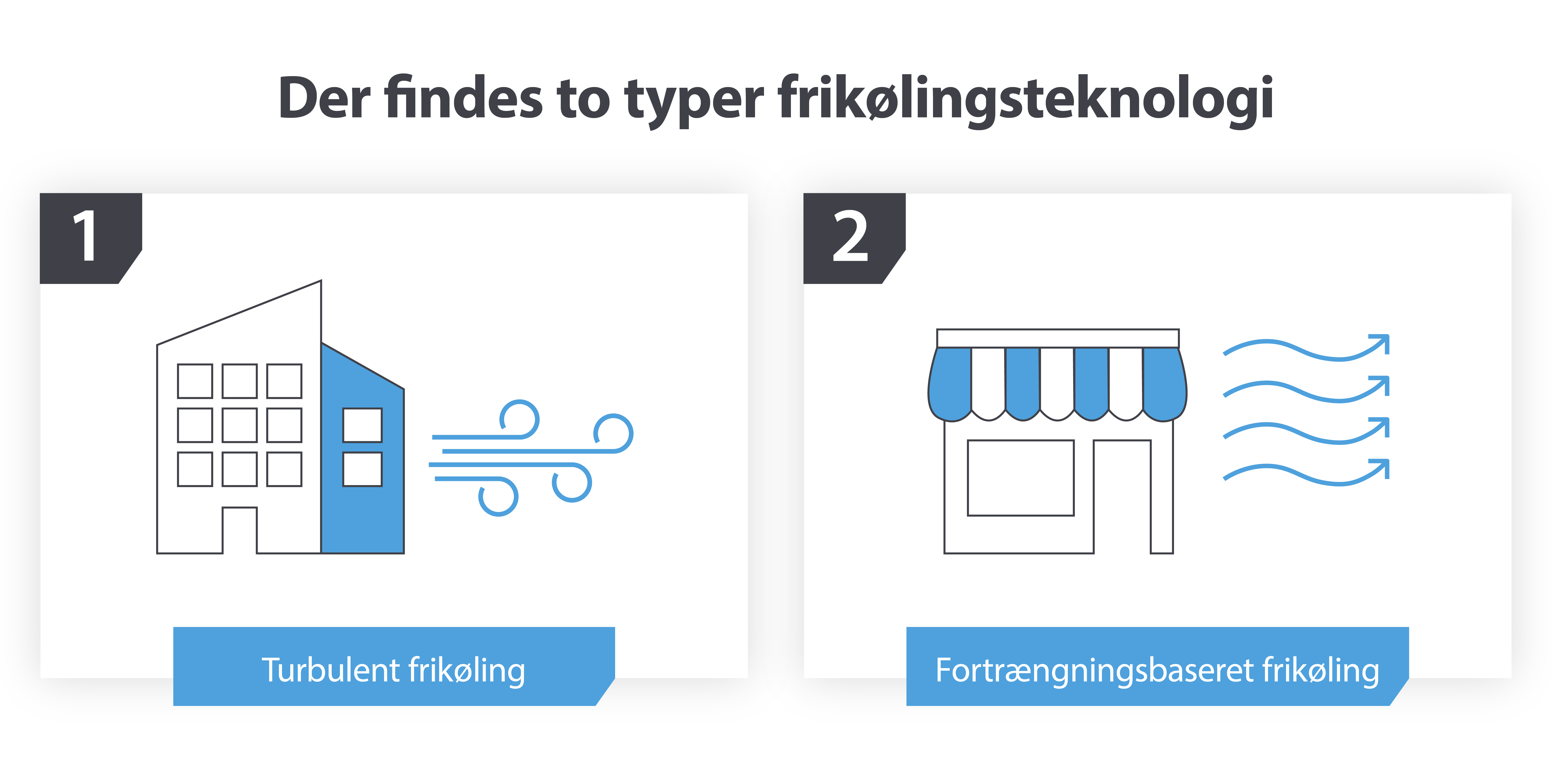 Det foretrukne valg til større bygninger eller shelters, der rummer mere teknisk udstyr med større varmebelastning, er fri køling via turbulens, der cirkulerer kølig udeluft gennem et rum. Dette giver den samme mængde køling i alle hjørner af et rum, før luften udsuges.