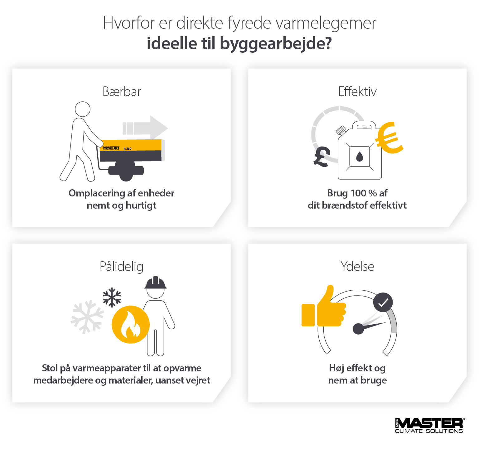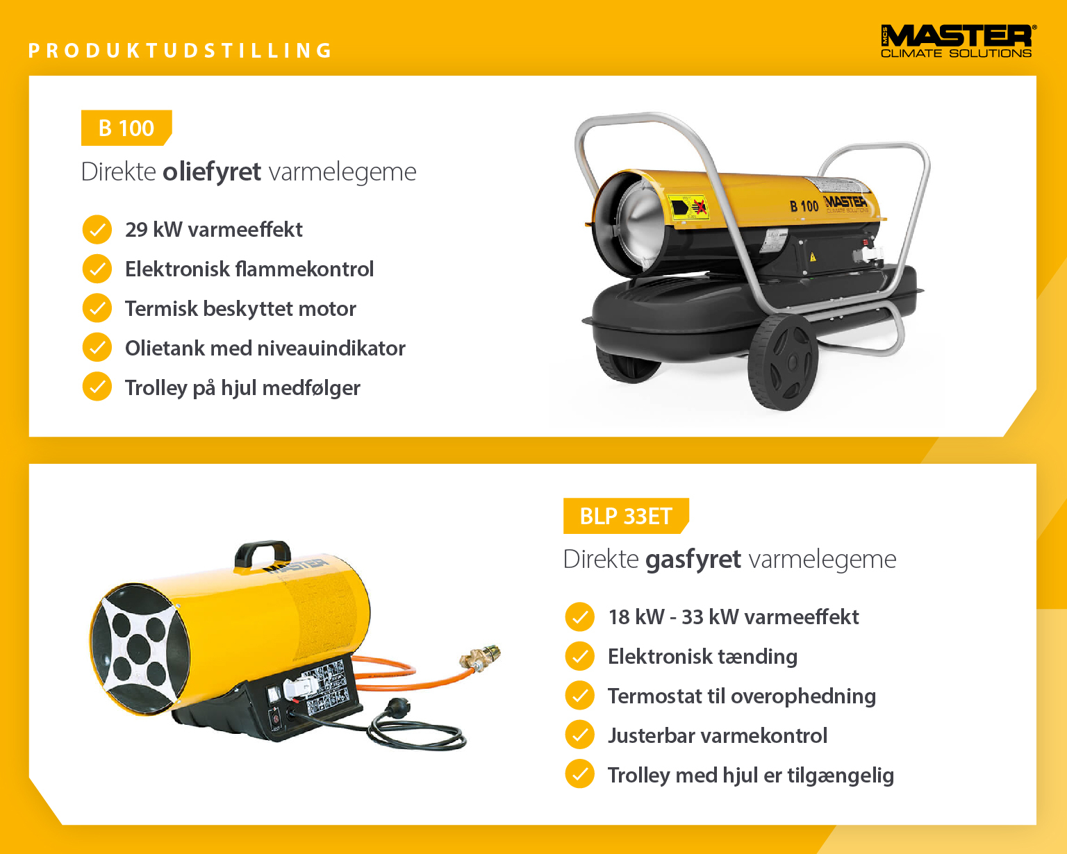 Master har stor erfaring i at levere effektive, bæredygtige og transportable olie- og gasfyrede varmeapparater til bygge- og anlægsbranchen. Uanset vejrforhold kan vores løsninger forbedre arbejdsmiljøet på byggepladsen til en lavere pris og med et lavere energiforbrug til gavn for såvel bundlinje som miljø.