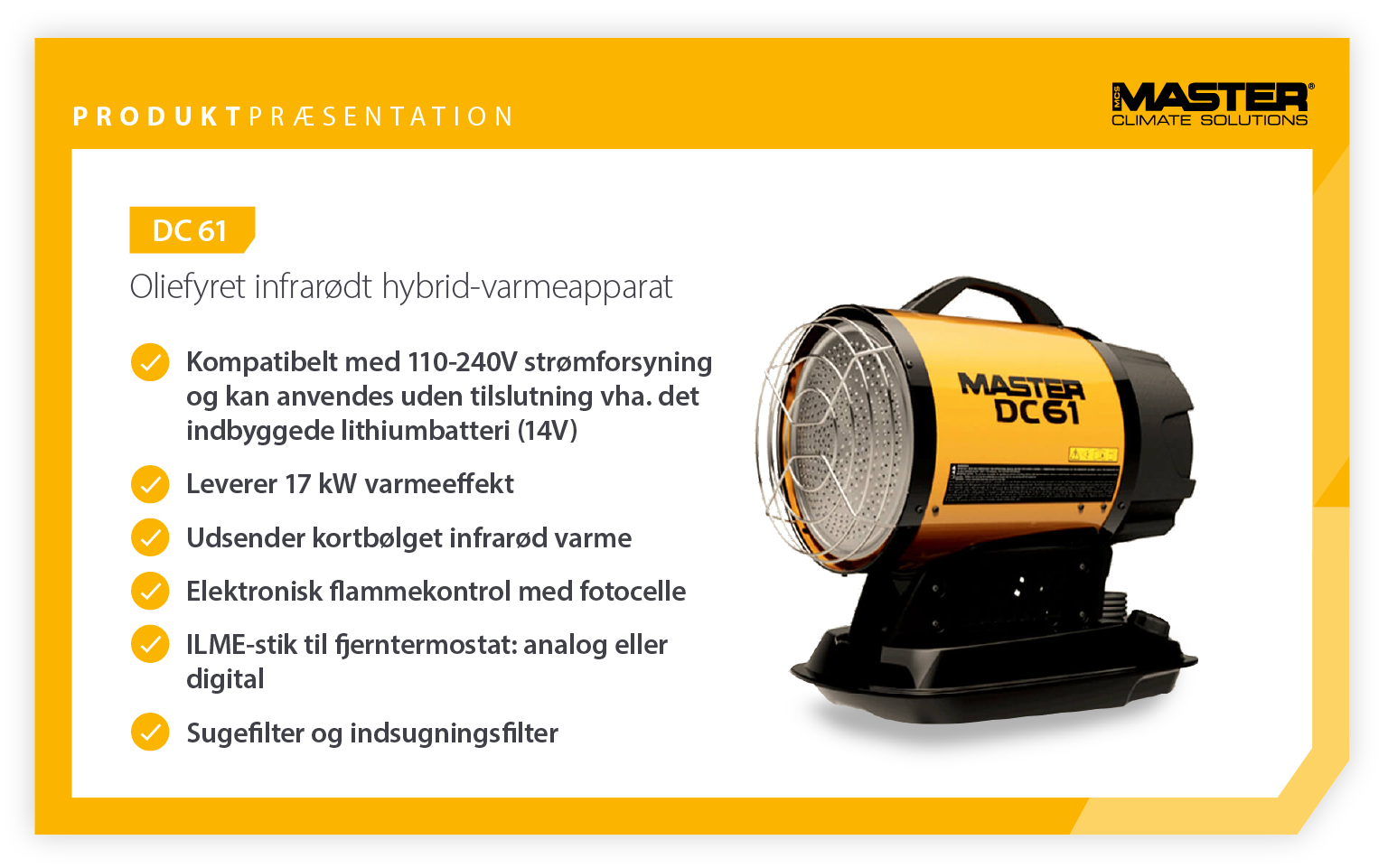 Master er eksperter i varmeløsninger. Med over 70 års ekspertise har vi ikke blot leveret utallige maskiner til sektorer over hele verden, vi har også designet og fremstillet et sortiment af robuste, pålidelige og effektive infrarøde varmeapparater.