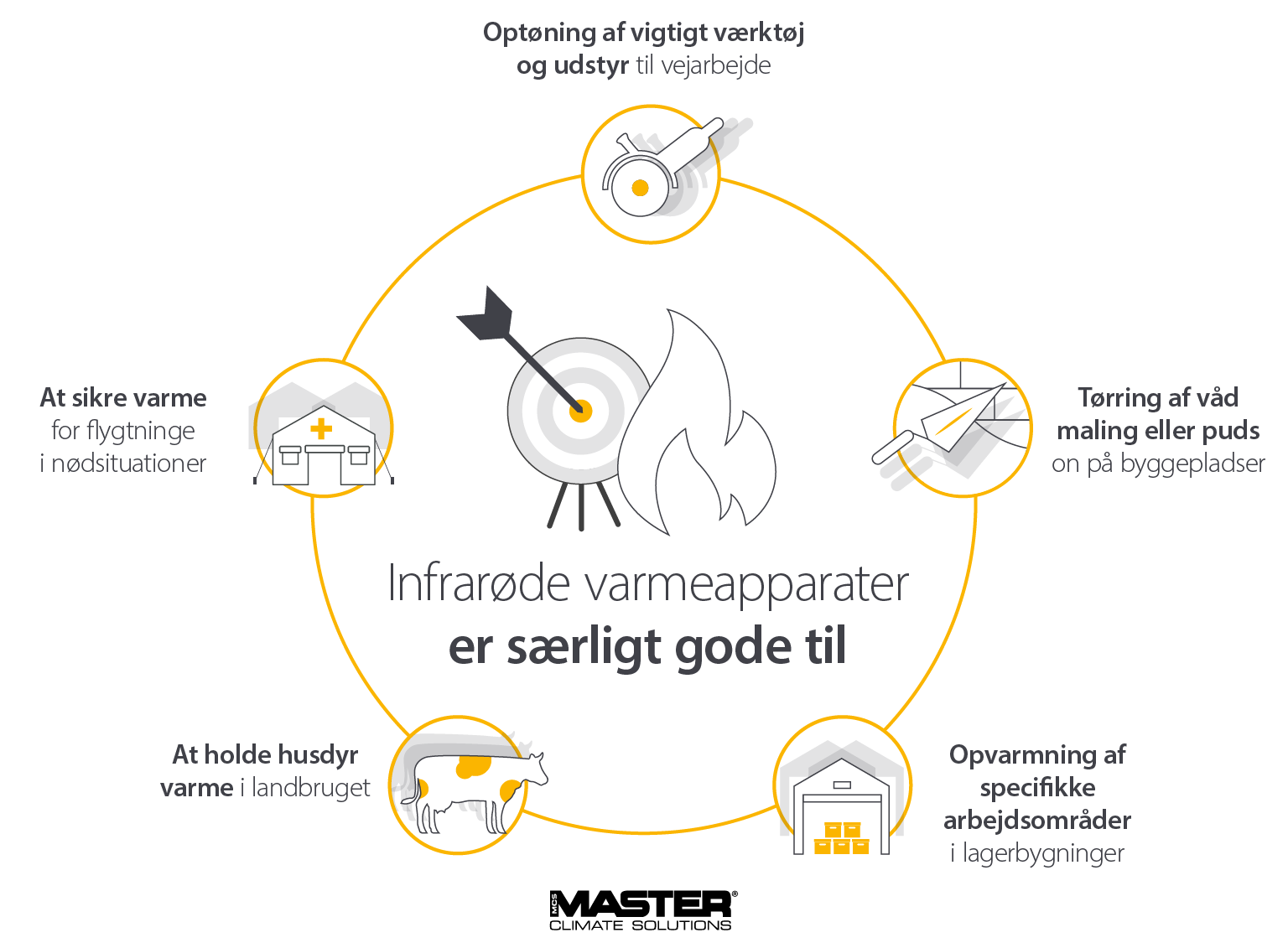 - Kommercielle infrarøde varmeapparater kan levere temperaturer på helt op til 150 °C. Derfor er det vigtigt at holde enhederne i sikker afstand fra mennesker og brændbare materialer.