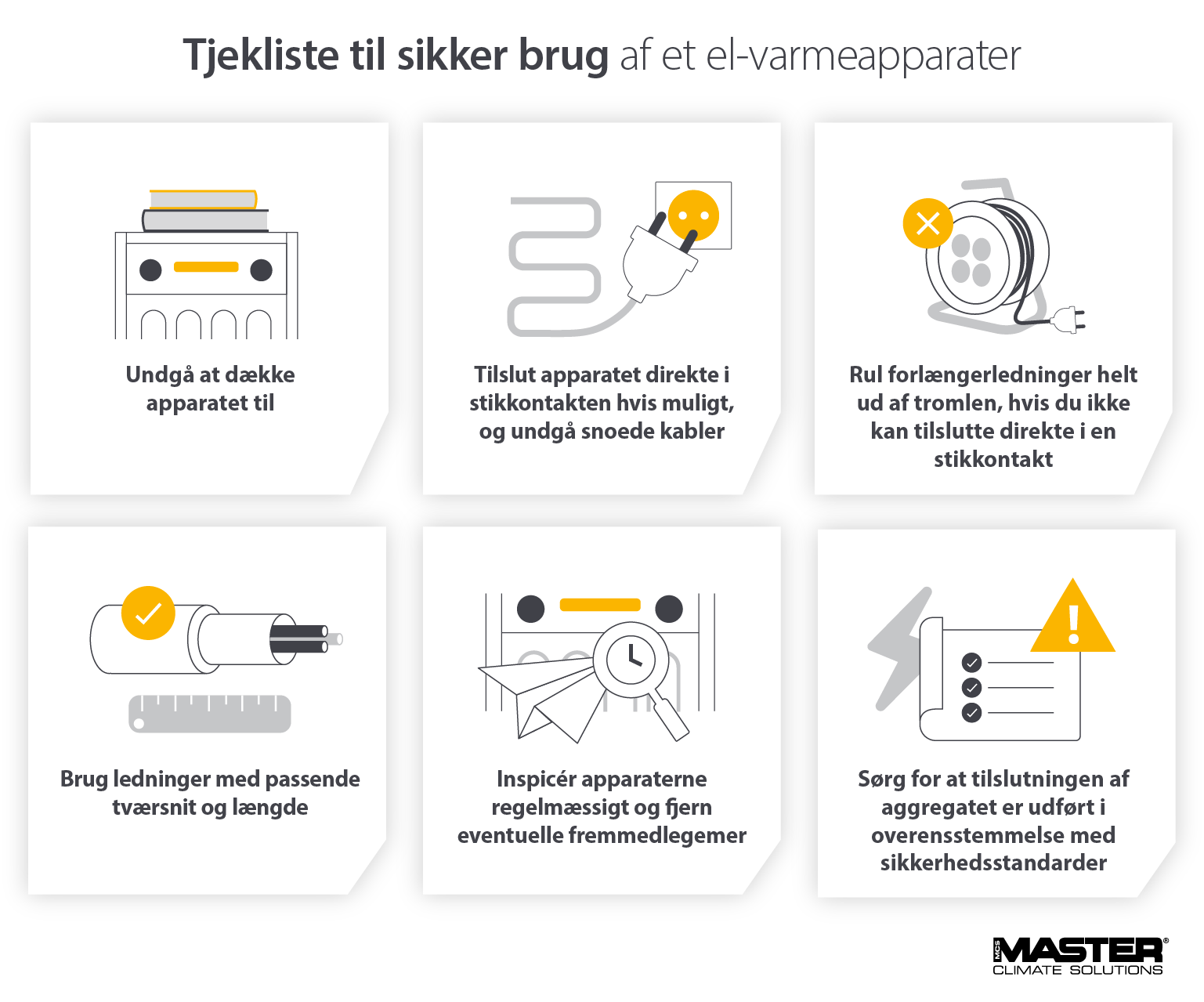 Elektriske varmeapparater er ualmindeligt sikre. Men for at maksimere sikkerheden for dem, der arbejder eller opholder sig i disse rum, er det vigtigt at læse den brugervejledning, der følger med enheden.