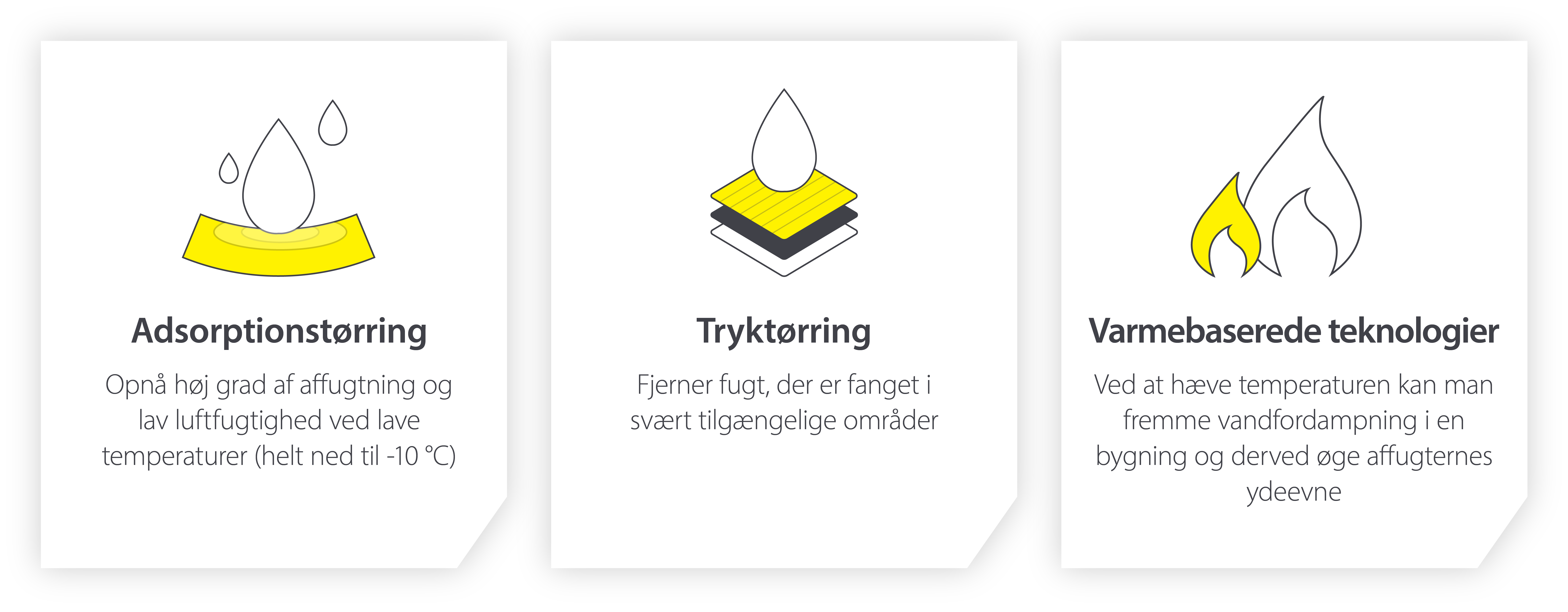 Moderne adsorptionsteknologier er en utrolig effektiv metode i koldere forhold og nyere bygninger med byggematerialer, der er vanskelige at tørre, såsom hårdttræ, tæt beton og isolering.