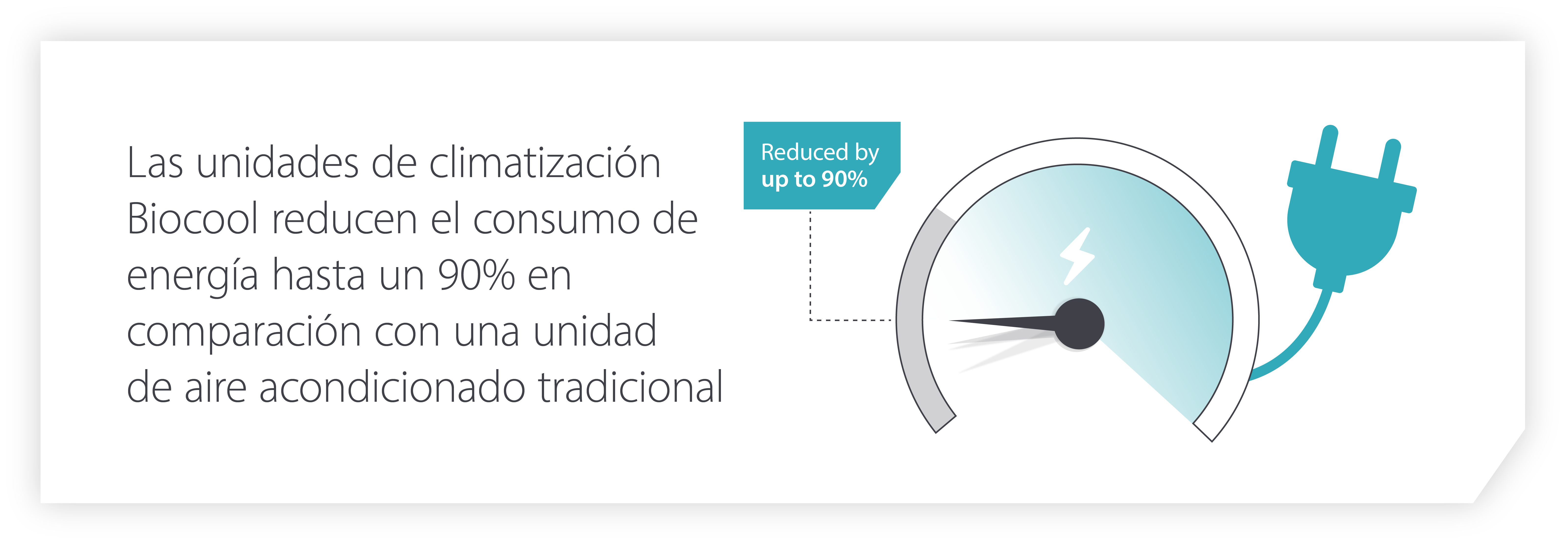 La bioclimatización de Biocool no sólo puede reducir el consumo de energía hasta un 90% (en comparación con una unidad de aire acondicionado tradicional), sino que también es una tecnología de enfriamiento eficaz sin el uso de gases refrigerantes contaminantes. El Bioclimatizador evaporativo (ECB) no utiliza gases refrigerantes, CFC o similares. El sistema se basa en el uso de agua natural para su funcionamiento, que además vuelve a la atmósfera en forma de vapor. El consumo de agua que utiliza el sistema es notablemente inferior al de otros métodos de generación de un kilovatio, ya sea por energía nuclear, hidráulica u otras fuentes.