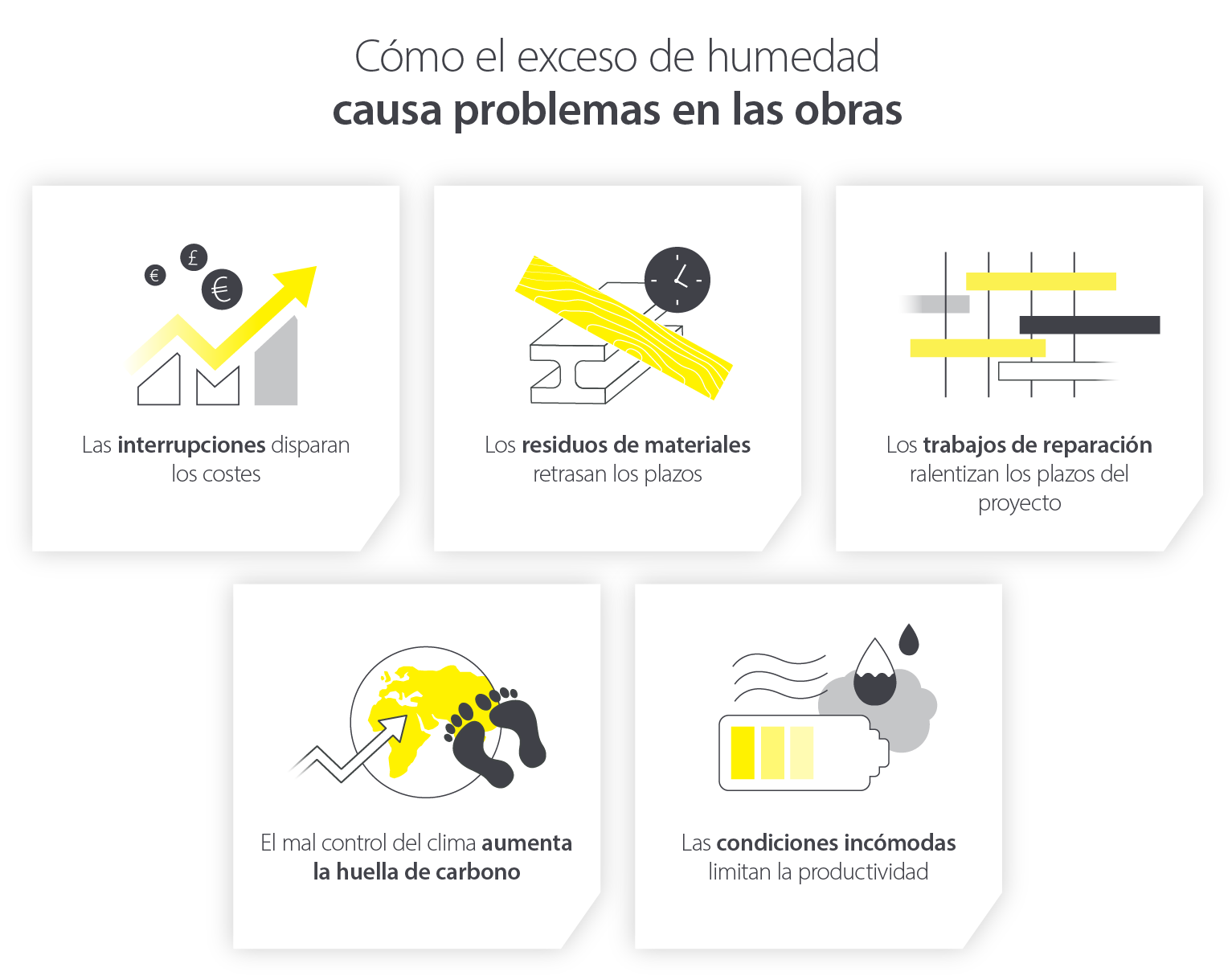 No controlar y gestionar los niveles de humedad no solo causa numerosos problemas para la salud y la seguridad de los trabajadores y el desarrollo de edificios, sino que estos efectos pueden tener consecuencias graves y de gran alcance a lo largo de un proyecto, como: