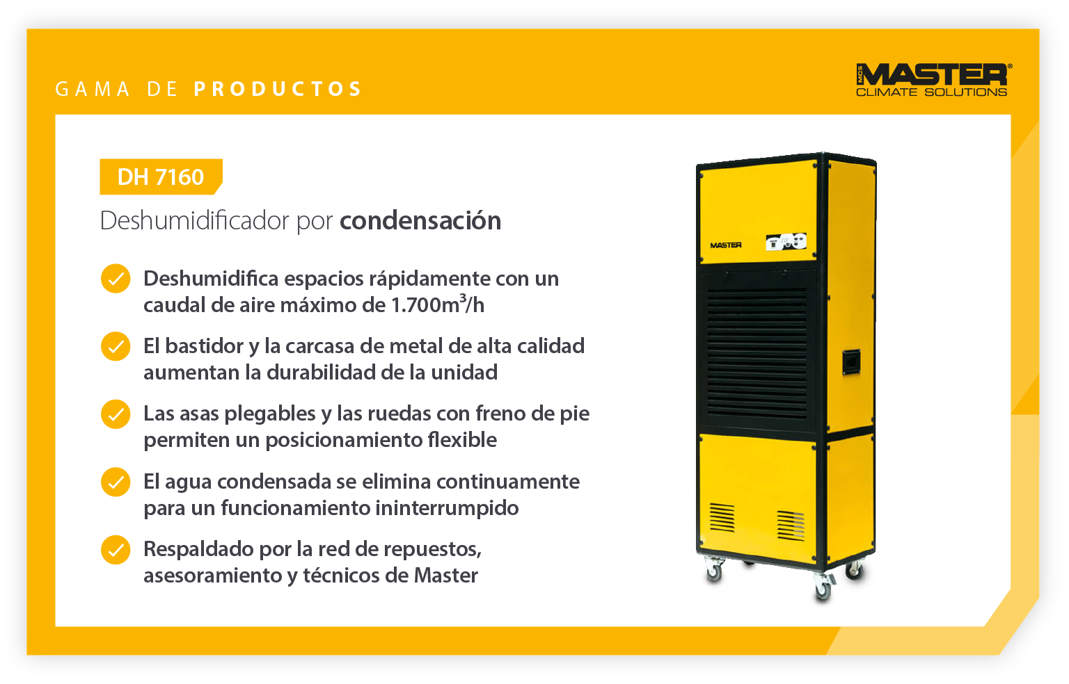 Después de considerar cuidadosamente las necesidades del cliente y la distribución de su espacio, optamos por tres deshumidificadores por condensación DH 7160 y los colocamos en ubicaciones estratégicas cerca de una puerta de almacén.