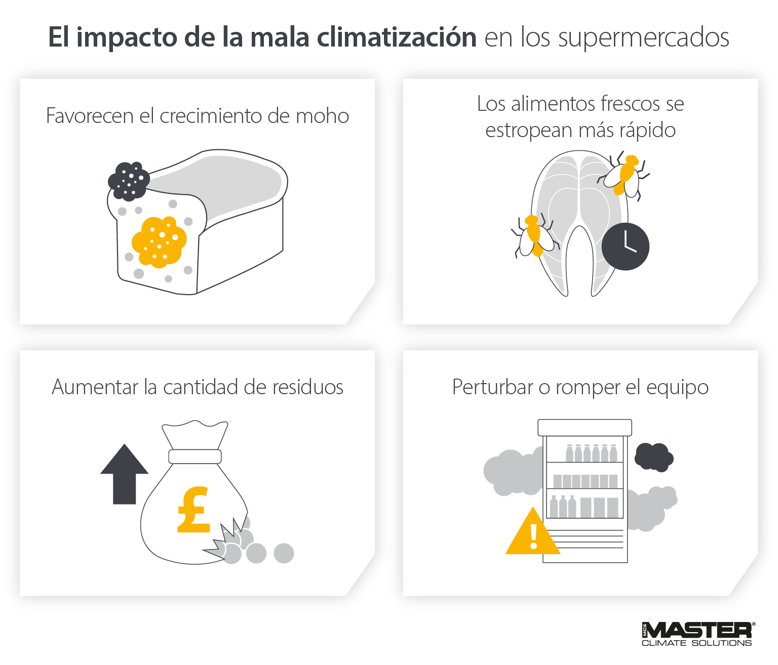 La combinación del movimiento de personas, los productos frescos, los grandes espacios y la constante apertura y cierre de puertas crea un entorno difícil de gestionar para los supermercados.