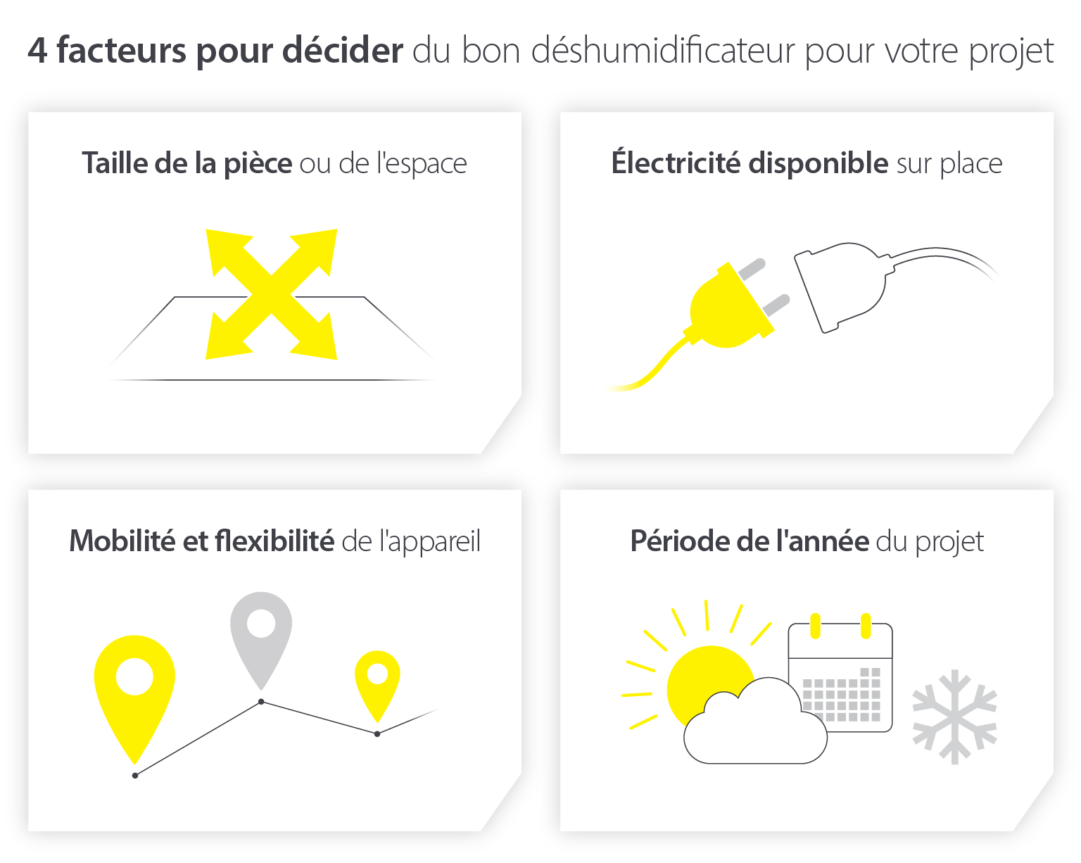 Pour éliminer efficacement l’humidité de l’air, il est important de choisir soigneusement le déshumidificateur adapté à vos besoins. Dans le cadre de ce processus, les entrepreneurs en bâtiment doivent prendre en compte les facteurs suivants :