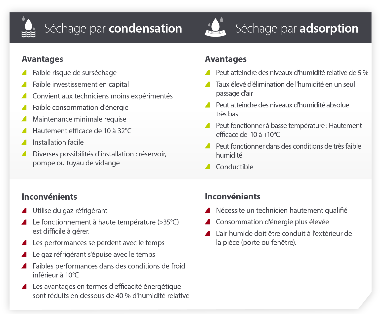 En éliminant l’excès d’humidité de l’air, la technologie de déshumidification permet de créer un environnement où les employés peuvent s’épanouir et où la santé des bâtiments est optimisée. Pour ce faire, il existe deux types de systèmes courants : les déshumidificateurs par adsorption et les déshumidificateurs à condensation.