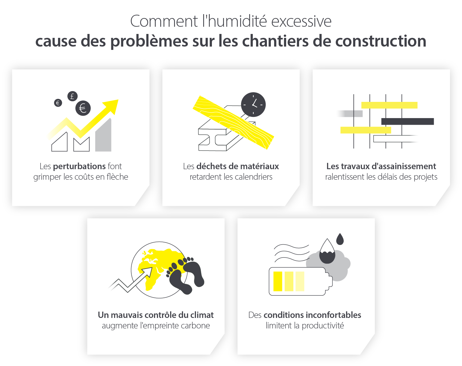 L’absence de contrôle et de gestion des niveaux d’humidité n’entraîne pas seulement de nombreux problèmes pour la santé et la sécurité des travailleurs et l'avancée des travaux. Ces effets peuvent avoir de graves conséquences tout au long d’un projet, telles que :