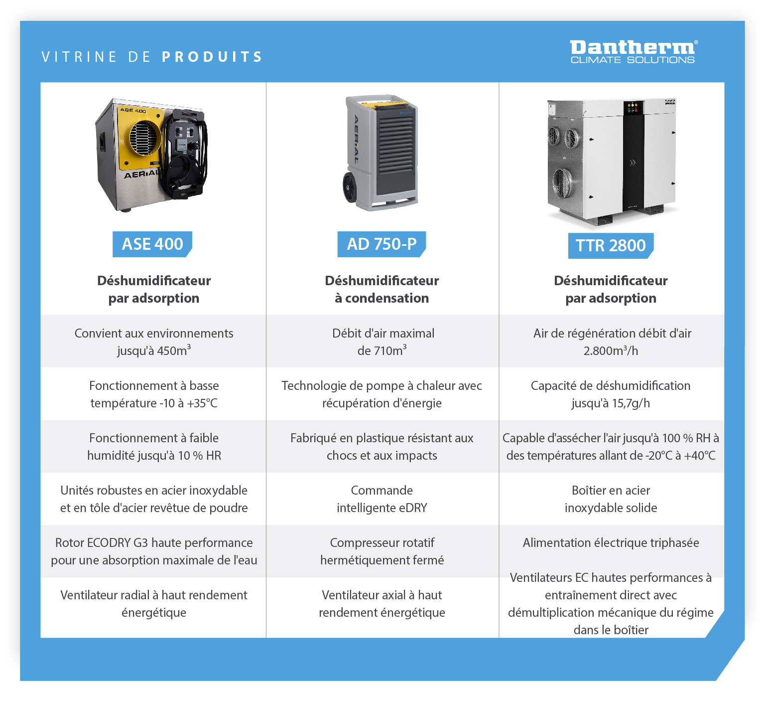 Pour maintenir la condensation à un minimum à l’intérieur et préserver la santé d’un bâtiment, les déshumidificateurs contrôlent le niveau d’humidité dans l’air.