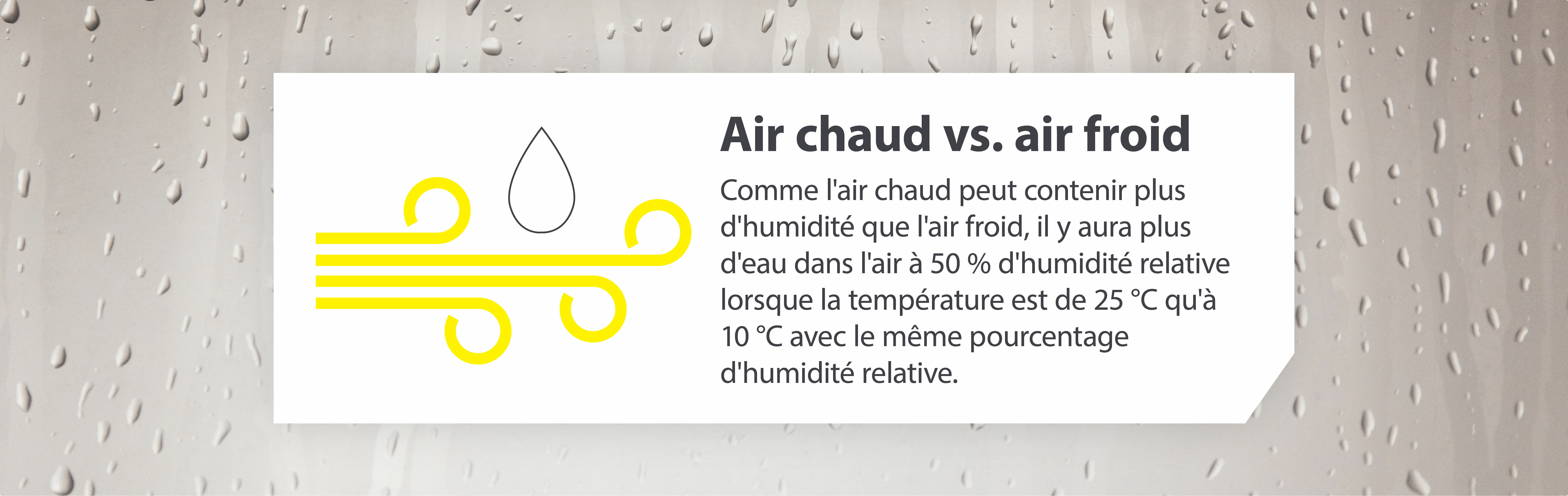 Lorsque la température baisse, l'humidité relative va augmenter, indiquant que l'air a moins de capacité à retenir l'humidité. Finalement, l'environnement atteindra 100 % ou le " point de rosée " - l'état dans lequel l'air ne peut plus retenir l'eau et commence à la libérer sous forme de condensation.