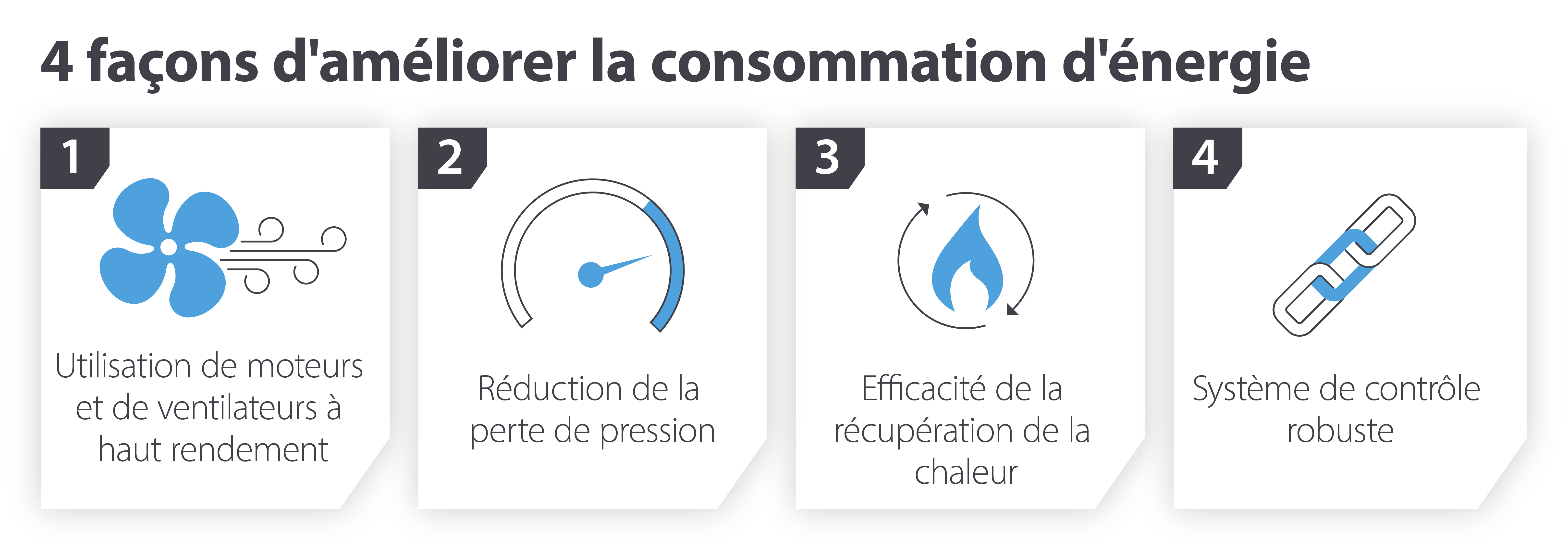 La prévention d’une chute de pression importante dans votre solution de traitement de l’air réduit la consommation d’énergie et maintient les niveaux de pression à un niveau constant et stable.