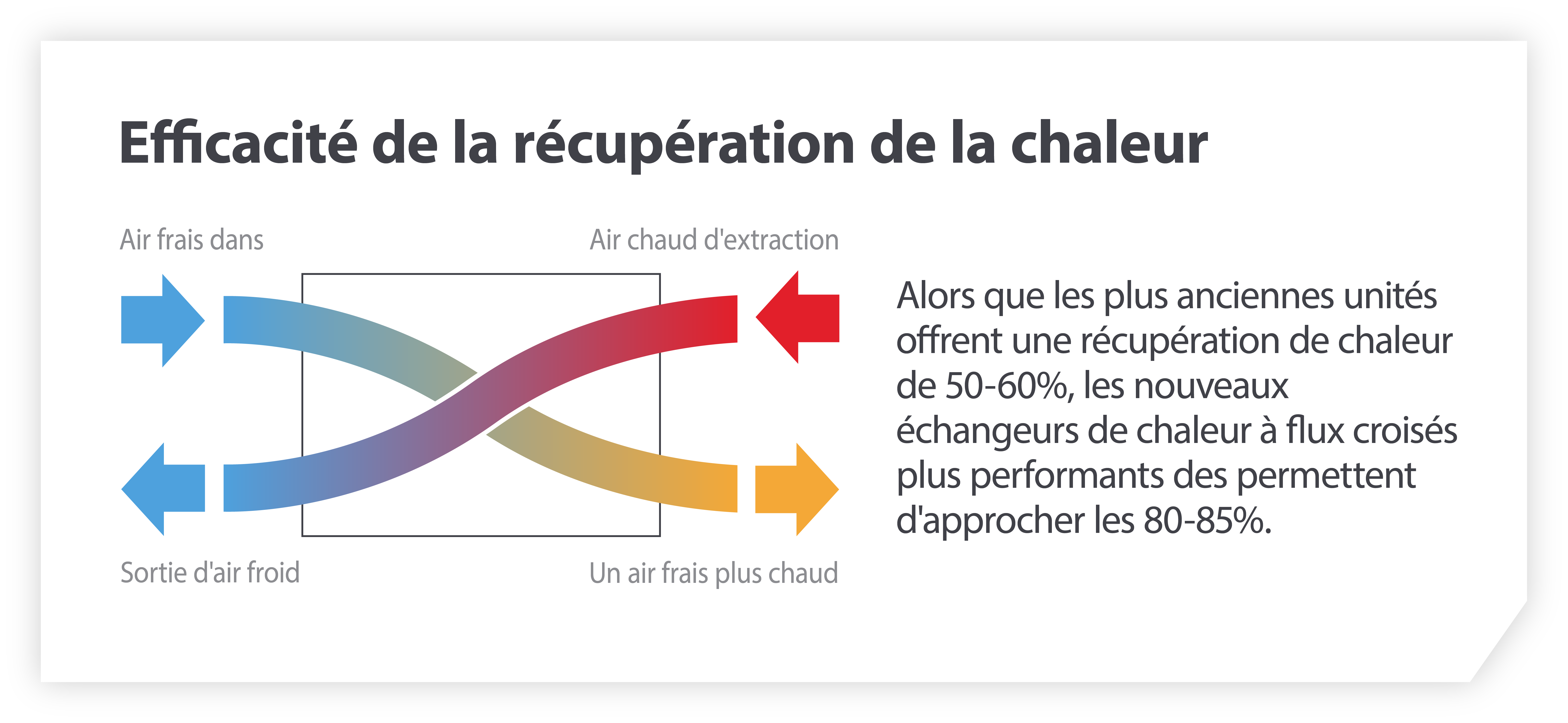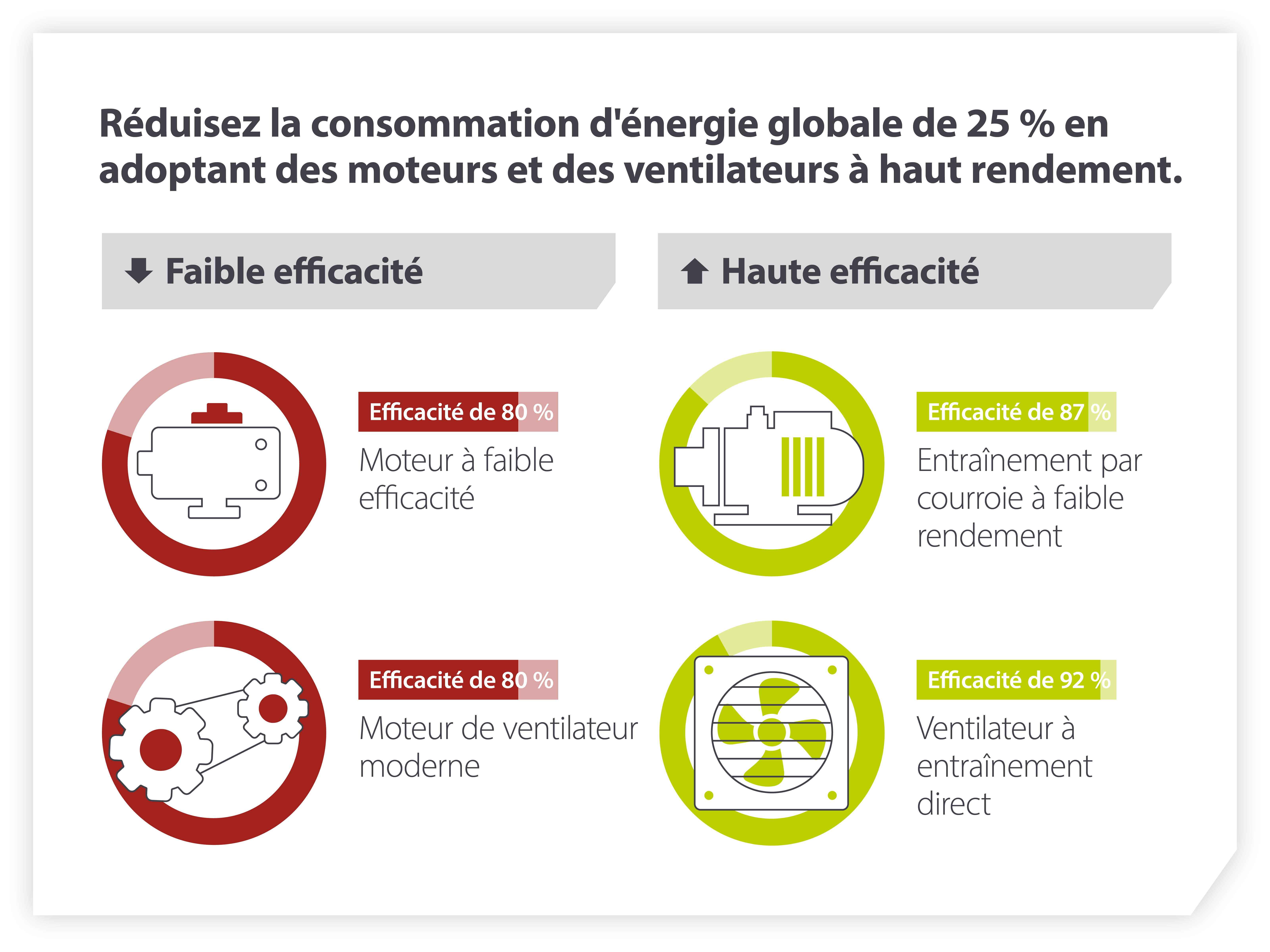 Considérez ce qui suit, en particulier si vous disposez d'une ancienne unité de traitement de l’air : l’utilisation d’un moteur à faible rendement (80 %) et d’un entraînement par courroie (80 %), par rapport à un moteur ventilateur normal (87 %) et à des ventilateurs à entraînement direct (92 %), peut entraîner une augmentation de 25 % de la consommation d’énergie globale.