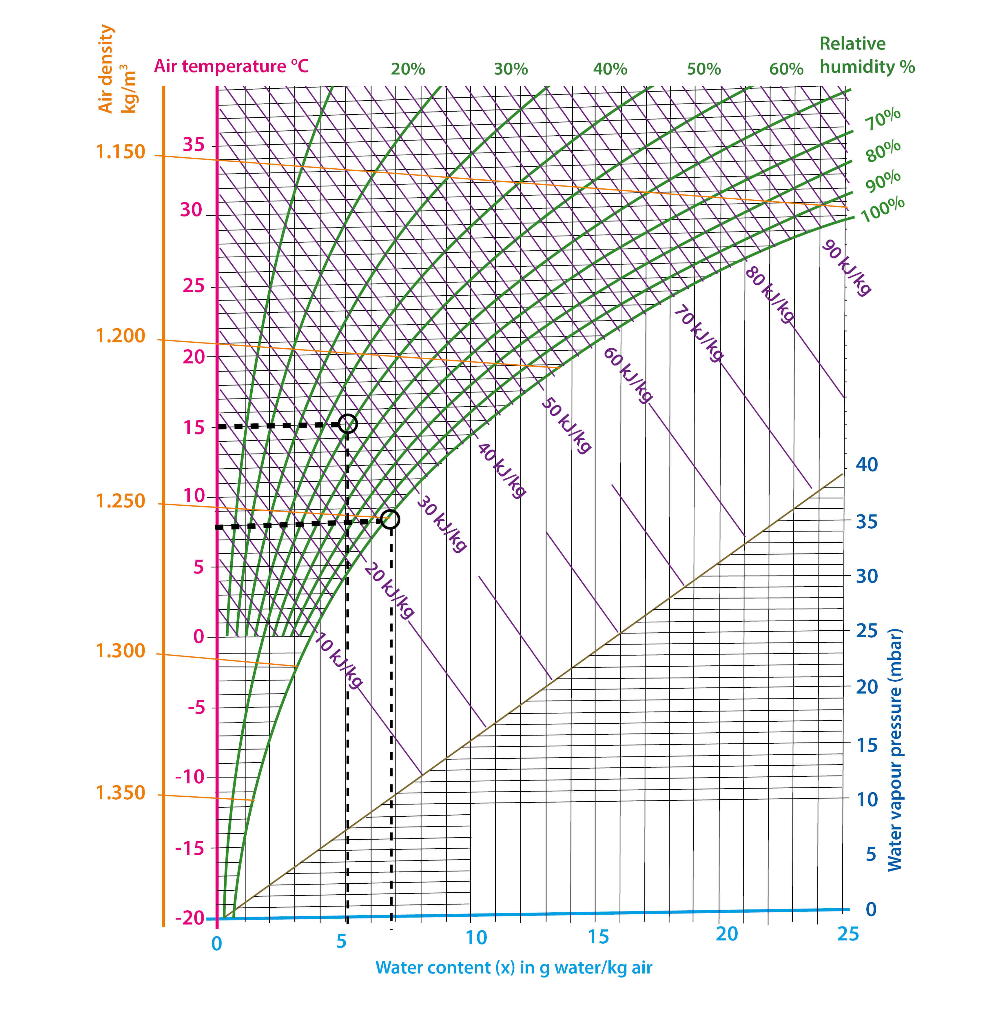 Dans cet exemple, il s’agit de déterminer les exigences de déshumidification d’un site de gestion d’eau avec une température de l’air de 15 °C et une valeur de HR souhaitée de 50 %. La taille des conduites d’eau est de 300 m3, la surface de l’eau est de 40 m2 et la température de l’eau est de 8 °C.
