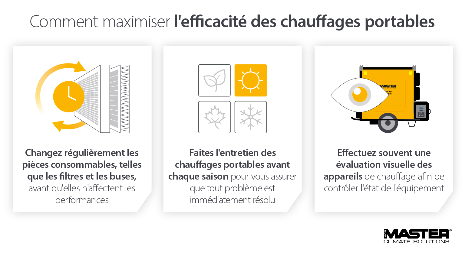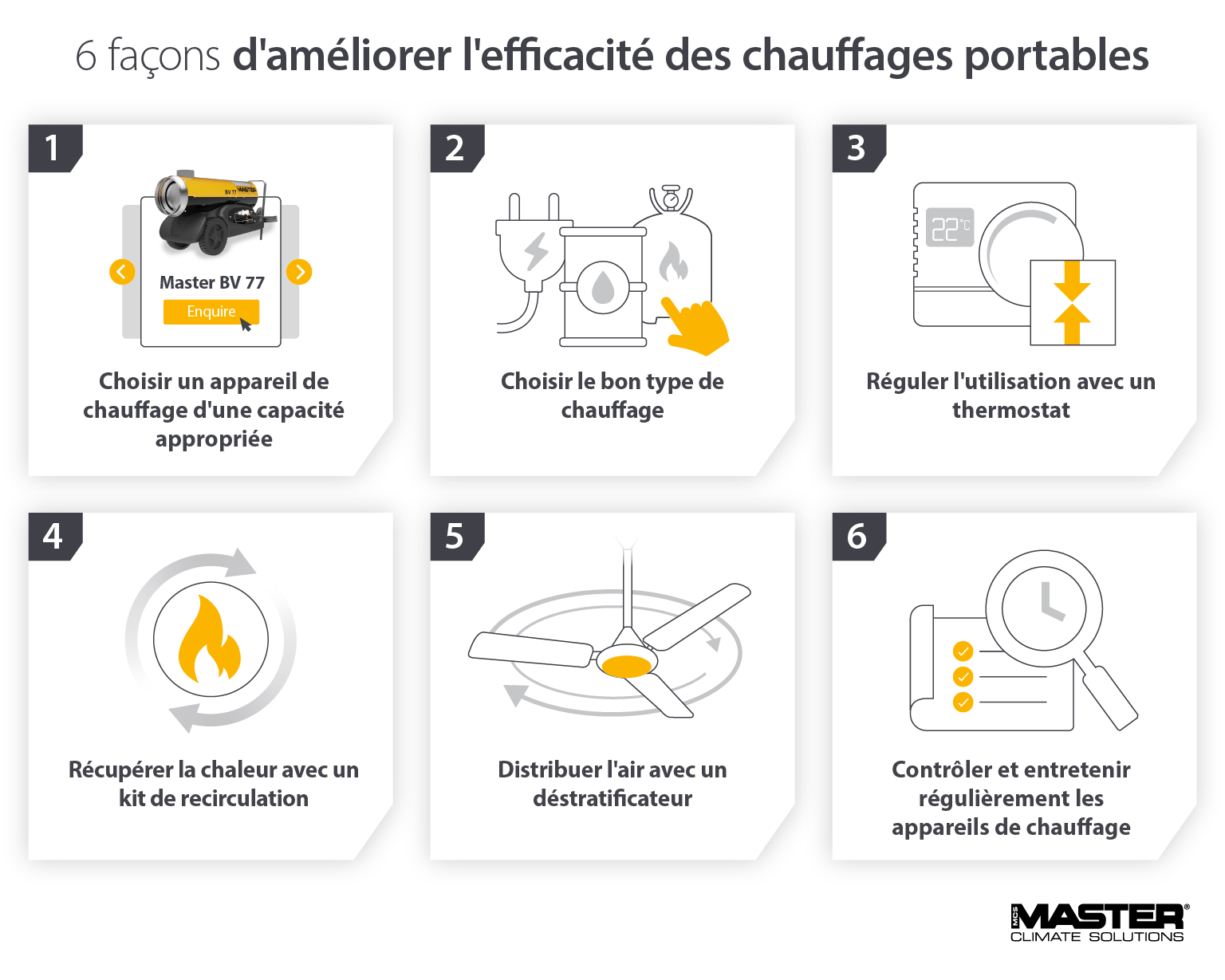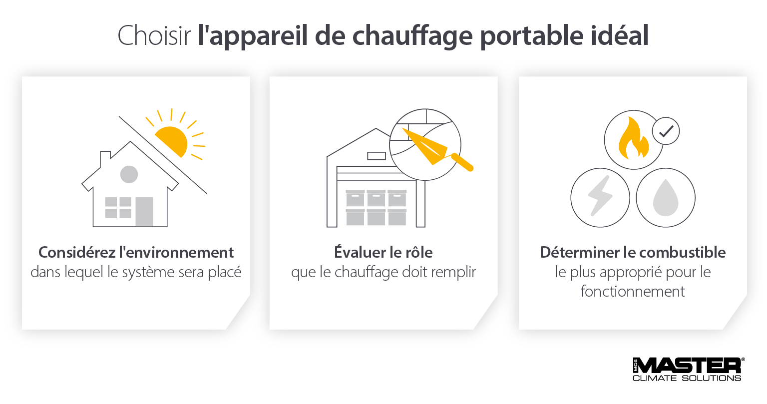Pourquoi est-il important de choisir le bon appareil de chauffage portable ? Si un chauffage inapproprié est sélectionné, il se peut qu’il ne soit pas en mesure de remplir efficacement la fonction souhaitée, voire pas du tout, ce qui augmente les coûts d’exploitation. Pour sélectionner le bon chauffage pour l'installation concernée :