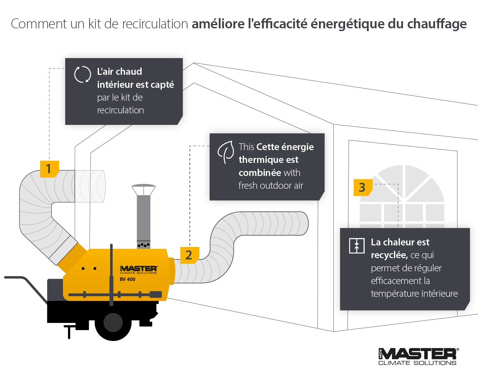 L’air chaud de l’intérieur d’un bâtiment est extrait. Cette chaleur est ensuite mélangée au courant d’air extérieur frais, créant une atmosphère chaude et propre à l’intérieur.