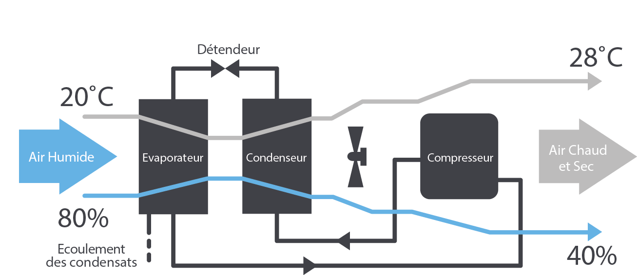 L’air humide est aspiré dans le déshumidificateur et dans un échangeur réfrigéré