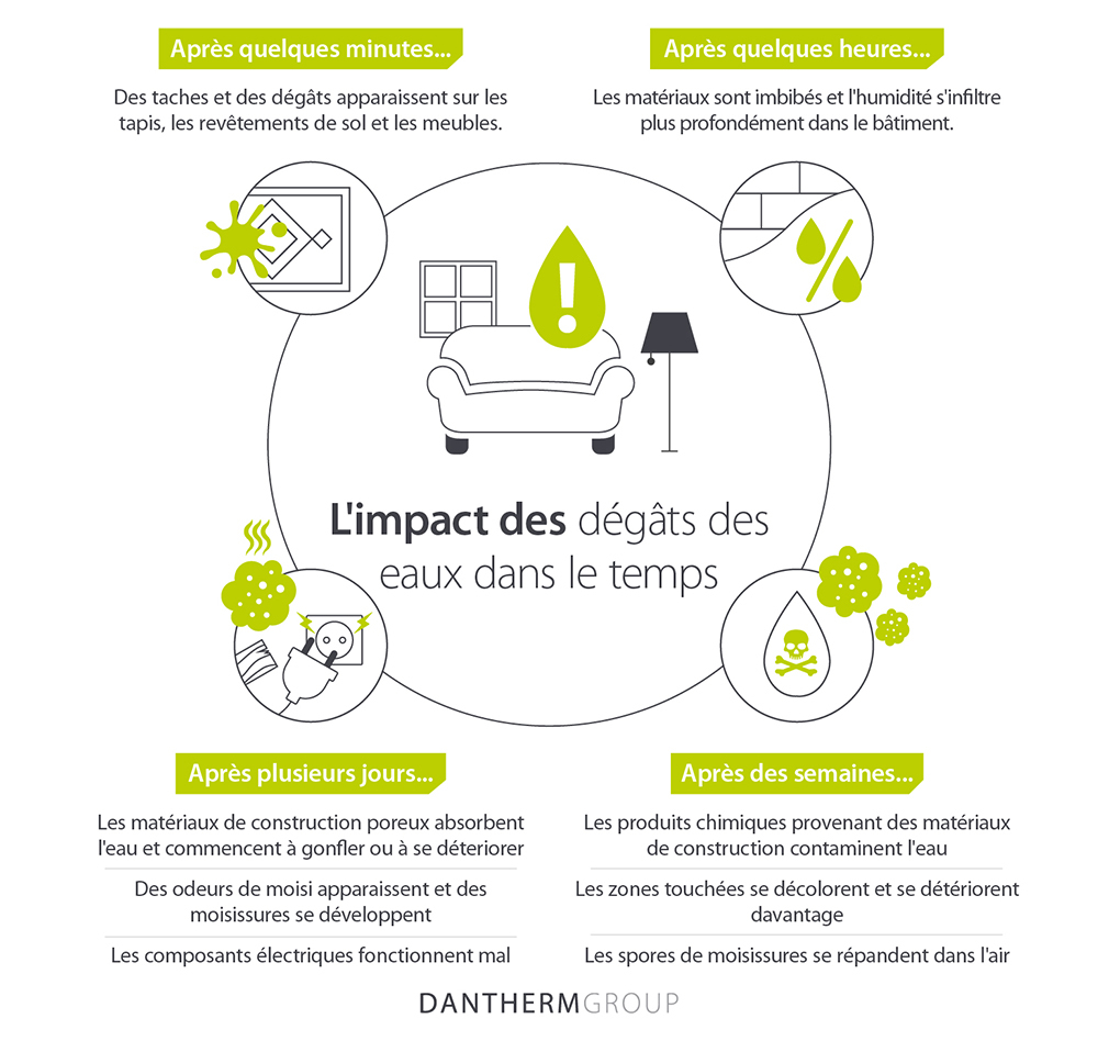Si on le laisse se répandre librement, l’excès d’eau peut avoir de graves ramifications. Les meubles et les objets peuvent être irrémédiablement endommagés. Les structures des bâtiments s’effondrent, entraînant des réparations coûteuses et à grande échelle. Des moisissures s'y développent, mettant en péril la santé des occupants.