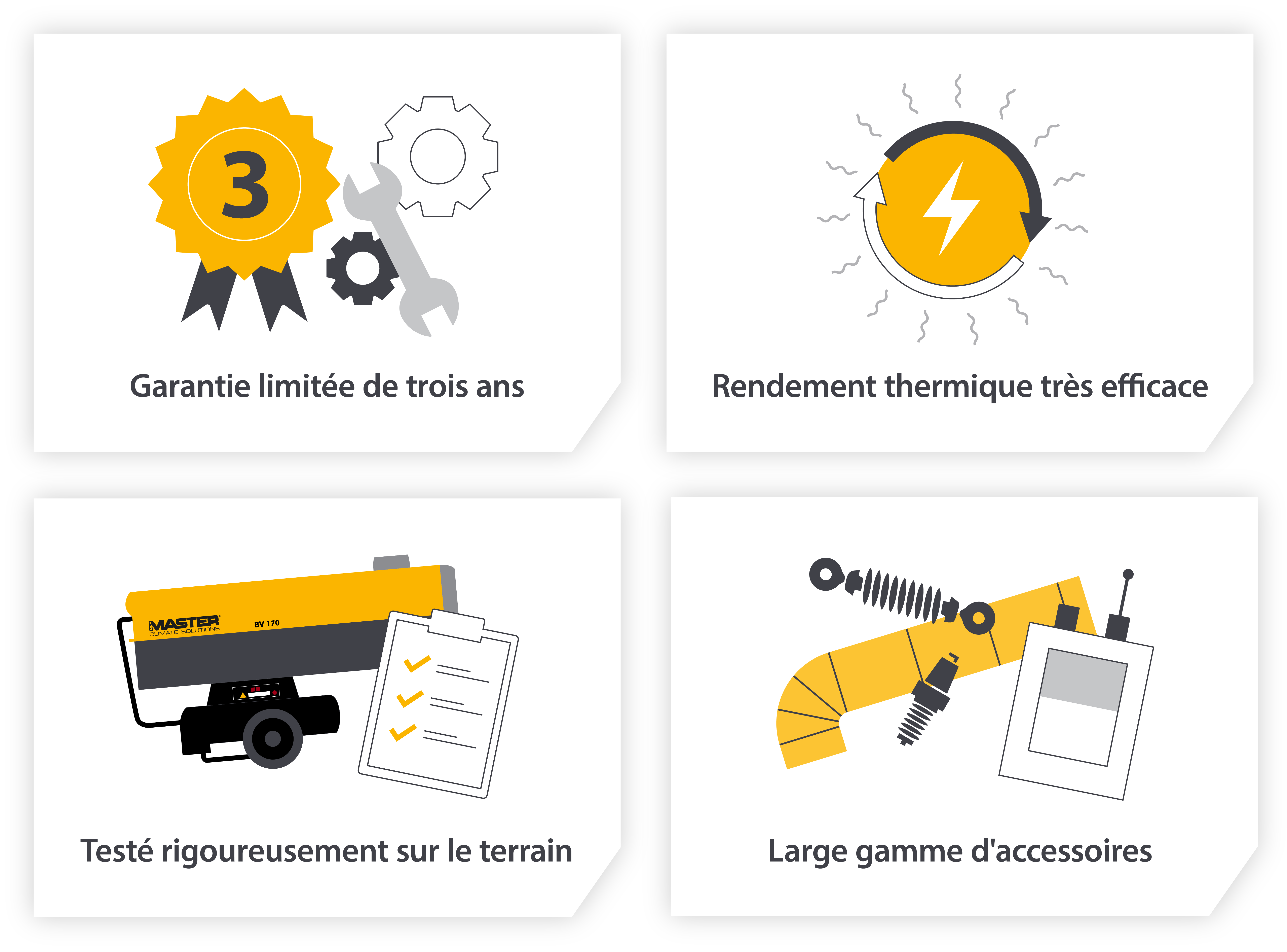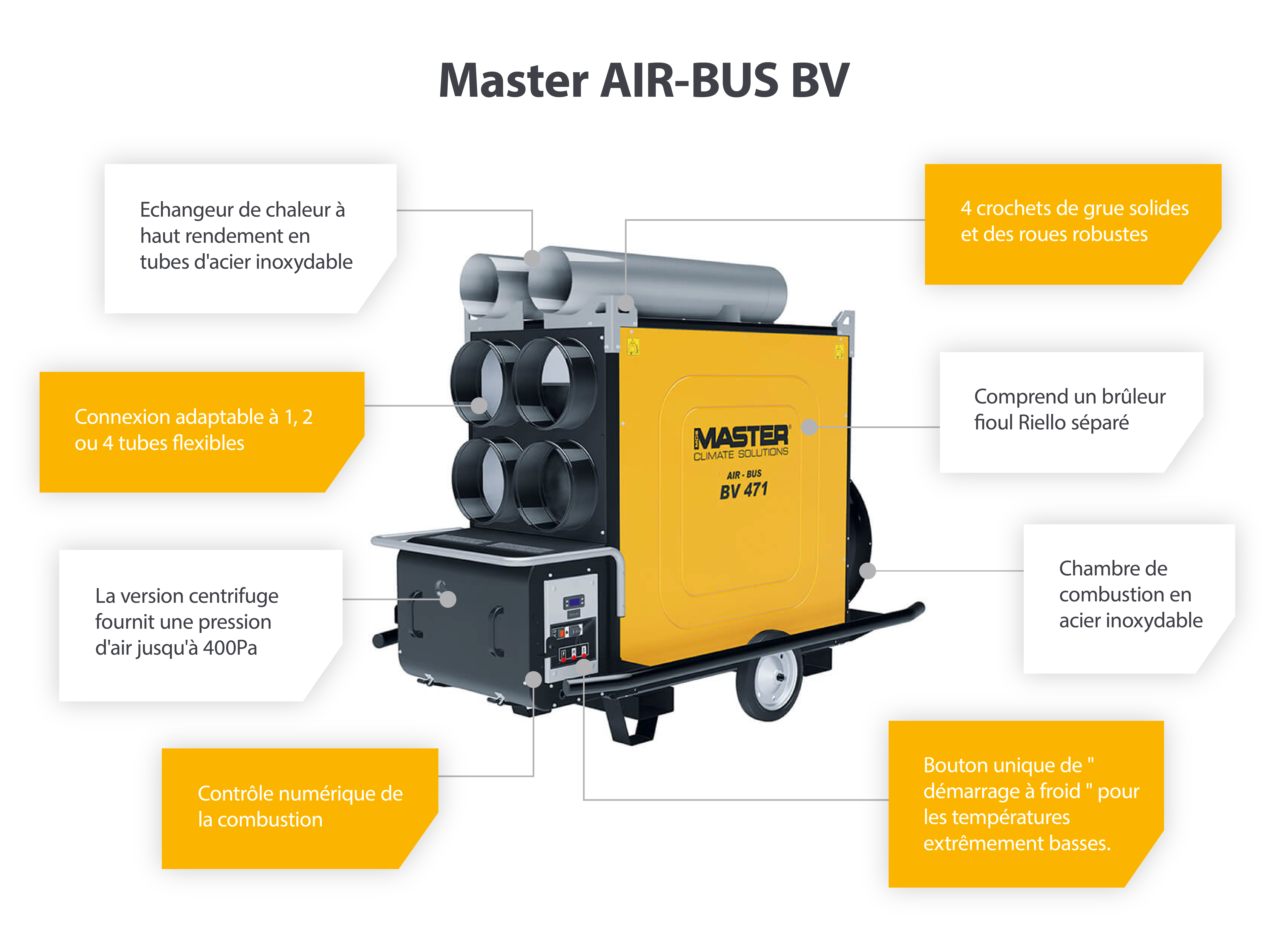Ce n’est pas un problème avec Master. Nos différentes unités BV sont capables de fournir entre 21 et 225 kW de puissance calorifique. Elles sont donc parfaitement adaptées à toutes les tailles de locaux, des petites tentes aux vastes bases militaires.