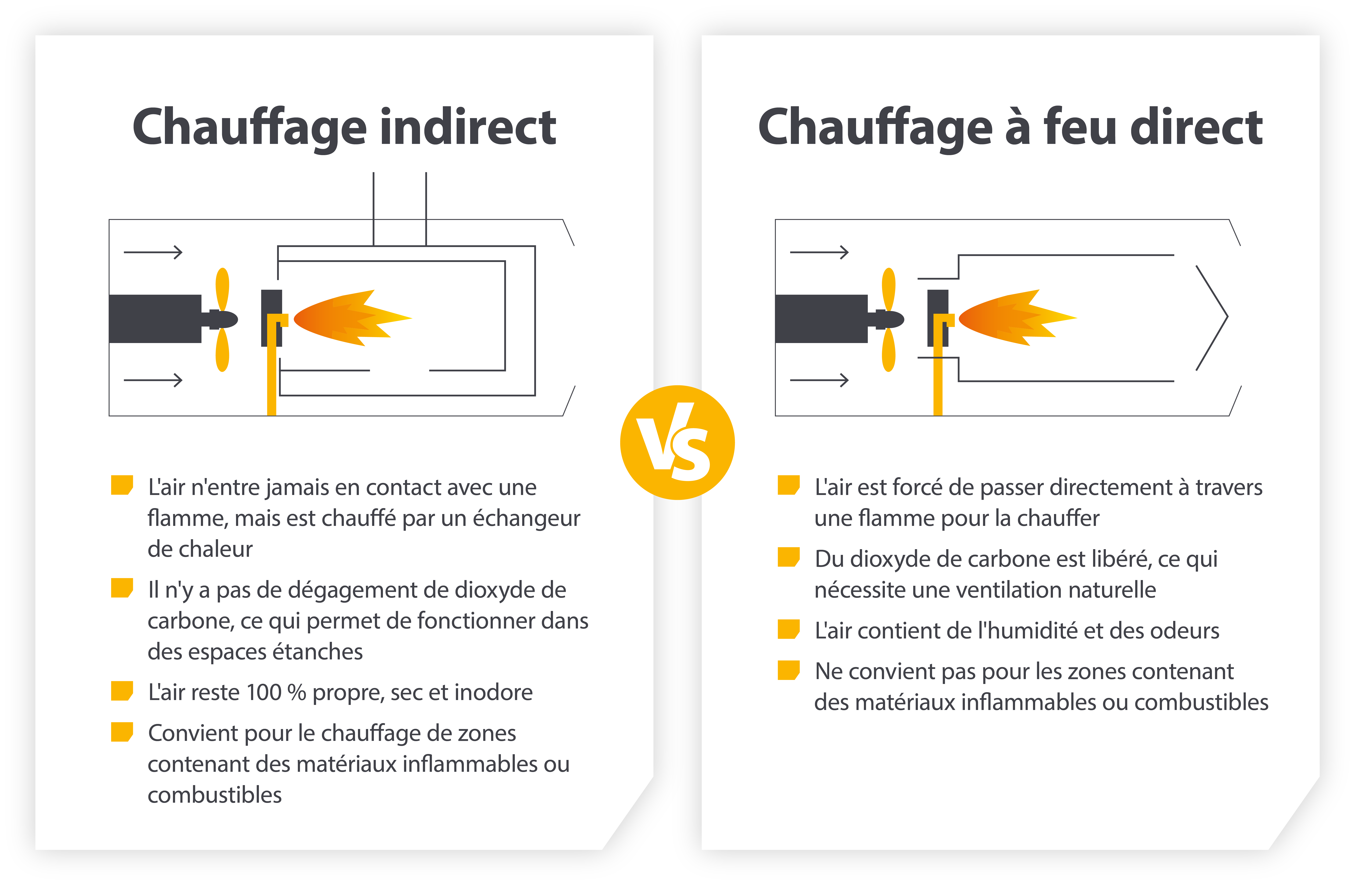 C’est pourquoi la gamme Master BV exploite des unités à combustion indirecte. Par conséquent, l’air chaud utilisé pour chauffer ces bâtiments temporaires n’entre jamais en contact direct avec une flamme. À la place, un échangeur de chaleur est utilisé pour s’assurer que seul de l’air chaud et propre pénètre dans les locaux, tandis que tous les produits de combustion s’échappent par une cheminée externe.