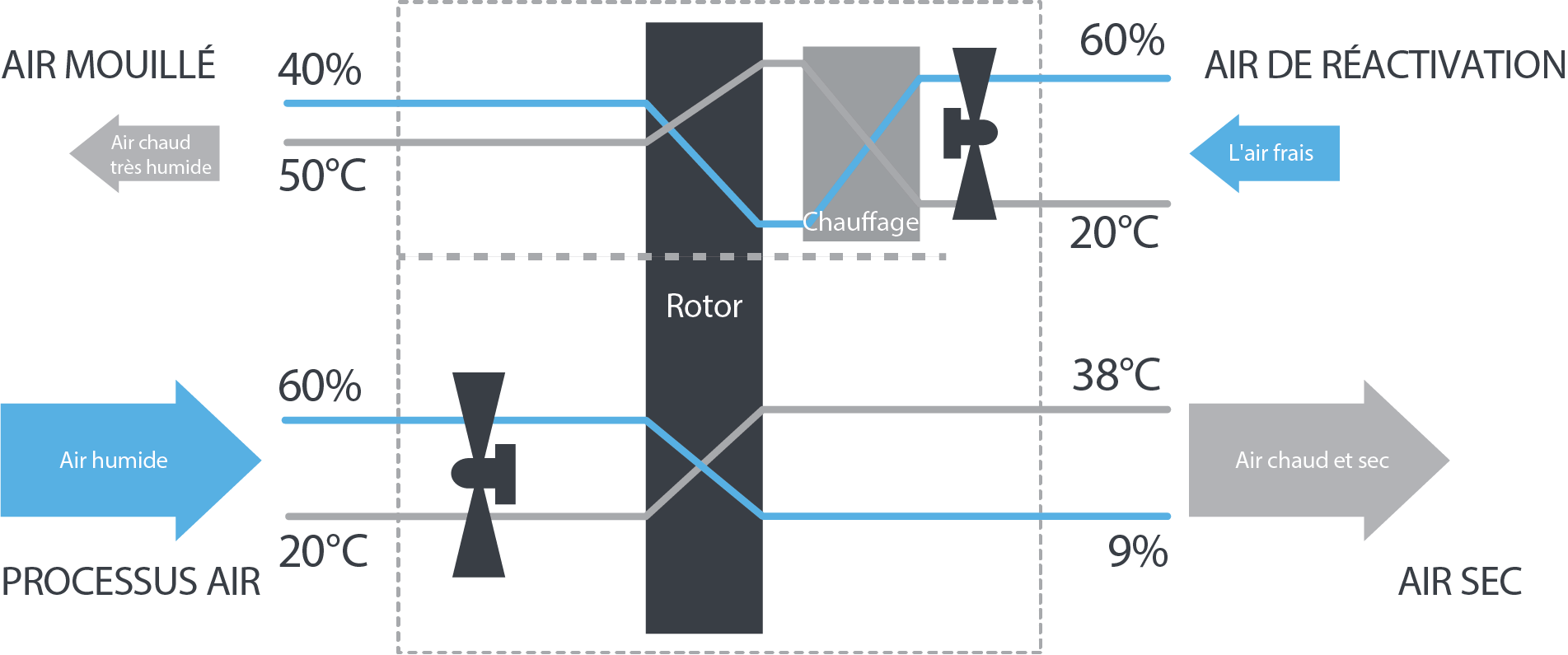 Un deuxième flux d’air plus petit (air de régénération) généralement chauffé à environ 120 °C est nécessaire pour éliminer l’humidité du rotor.