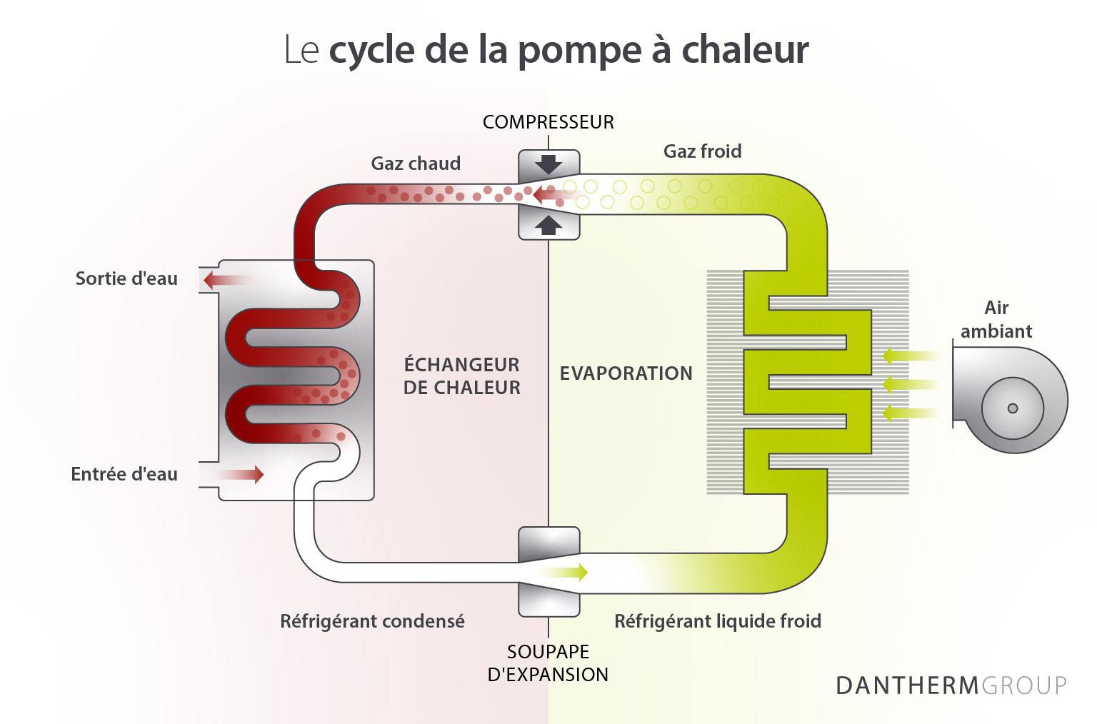 Une pompe à chaleur utilise l’électricité et du réfrigérant pour déplacer la chaleur d’un endroit à un autre. Pour fournir de la chaleur, elle extrait la chaleur de l’air extérieur et la transfère vers un réfrigérant. Le réfrigérant est ensuite comprimé, ce qui augmente considérablement la température. Le réfrigérant chaud est alors déplacé dans la pompe, qui fait passer l’eau de la piscine sur le réseau contenant le réfrigérant chaud, pour la réchauffer.