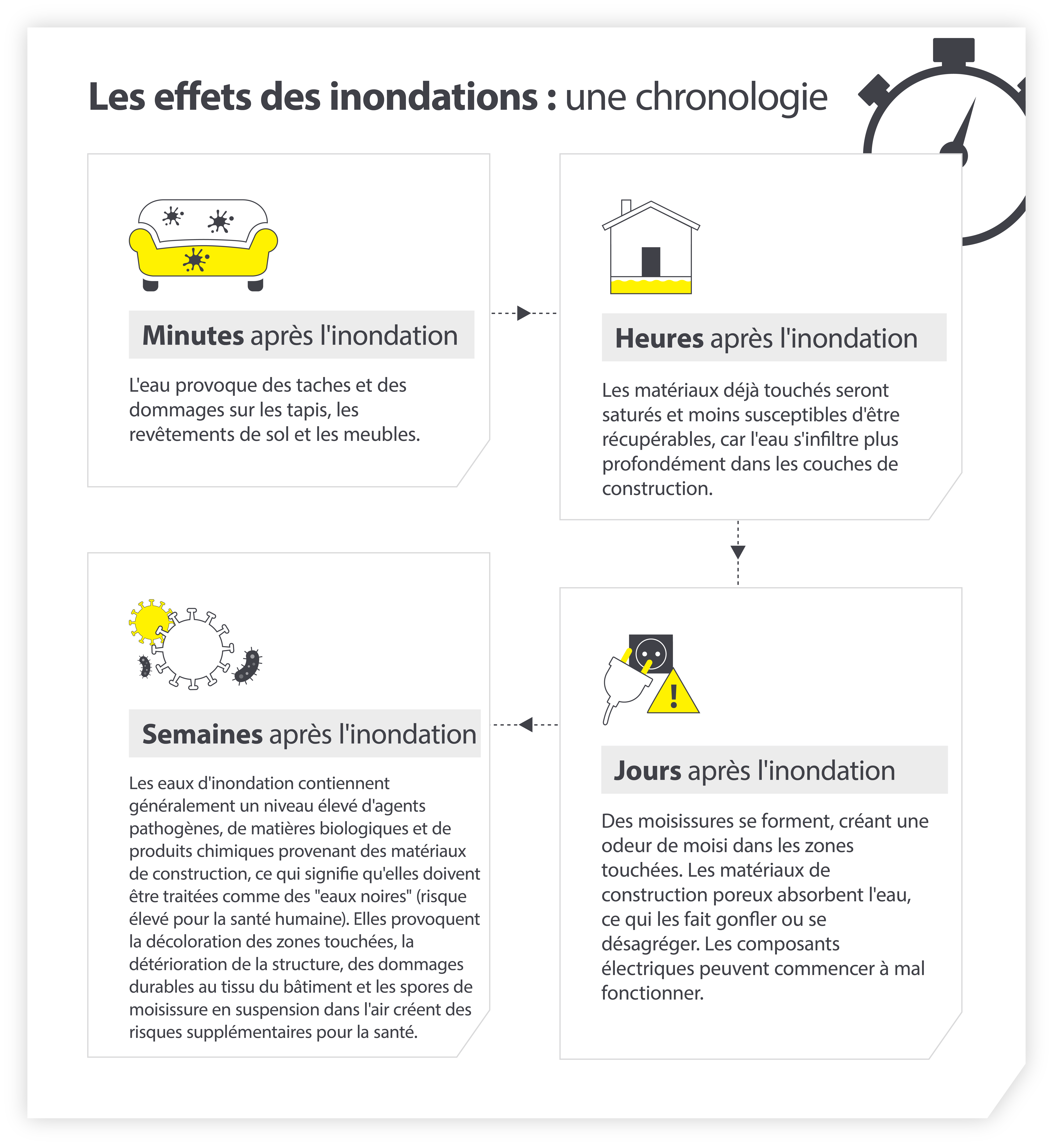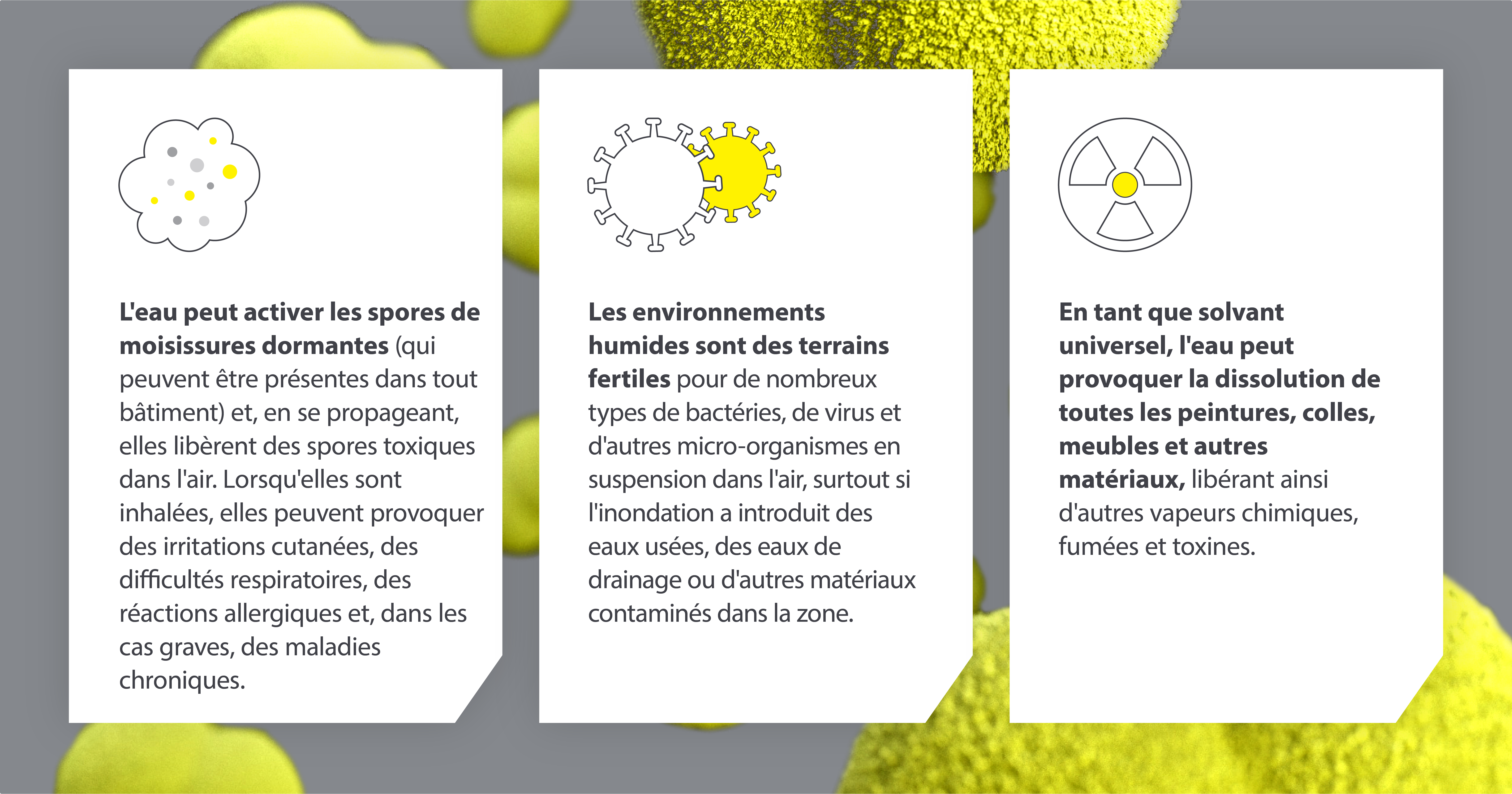 Qu’il s’agisse d’eau stagnante dans les cavités murales et les fondations d’un bâtiment, qui finit par causer des dommages supplémentaires et des réparations coûteuses, ou du risque de propagation de moisissures et de bactéries dangereuses pour la santé des occupants des bâtiments touchés, les conséquences à long terme d’une inondation peuvent être importantes.