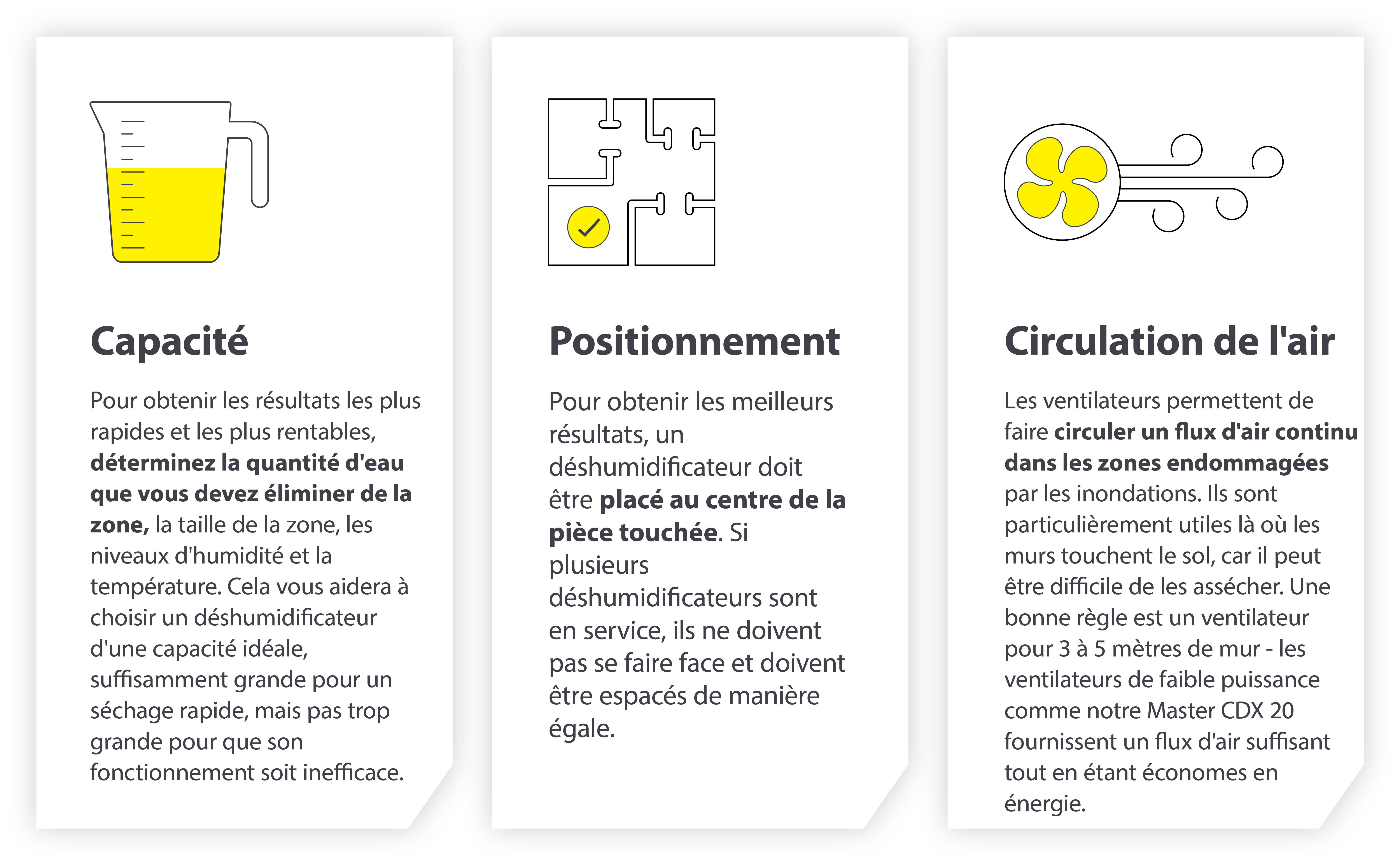 Pour répondre à tous ces critères, il faut disposer de l’équipement approprié : aspirateurs d’eau, produits chimiques, déshumidificateurs, chauffages, unités de ventilation, purificateurs d’air, etc. de fournisseurs de confiance tels que Dantherm, Trotec et Master.