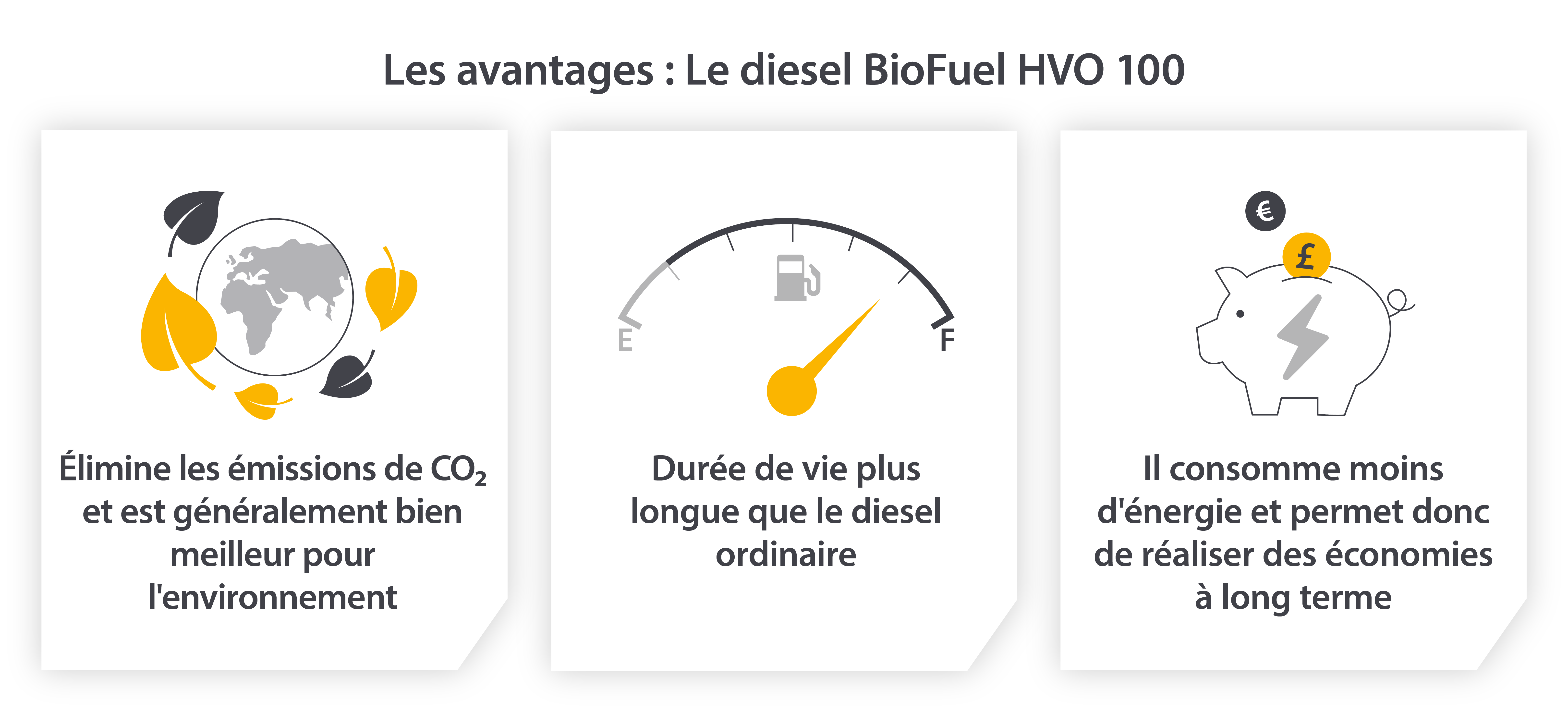 Le plus grand avantage de ce biocarburant est qu’il marque une avancée significative en matière de protection de l'environnement et qu’il nous permettra à tous de faire un bond en avant vers des carburants plus durables. La solution alternative au biodiesel émet des émissions nettes de gaz à effet de serre beaucoup plus faibles et peut réduire considérablement votre empreinte carbone.