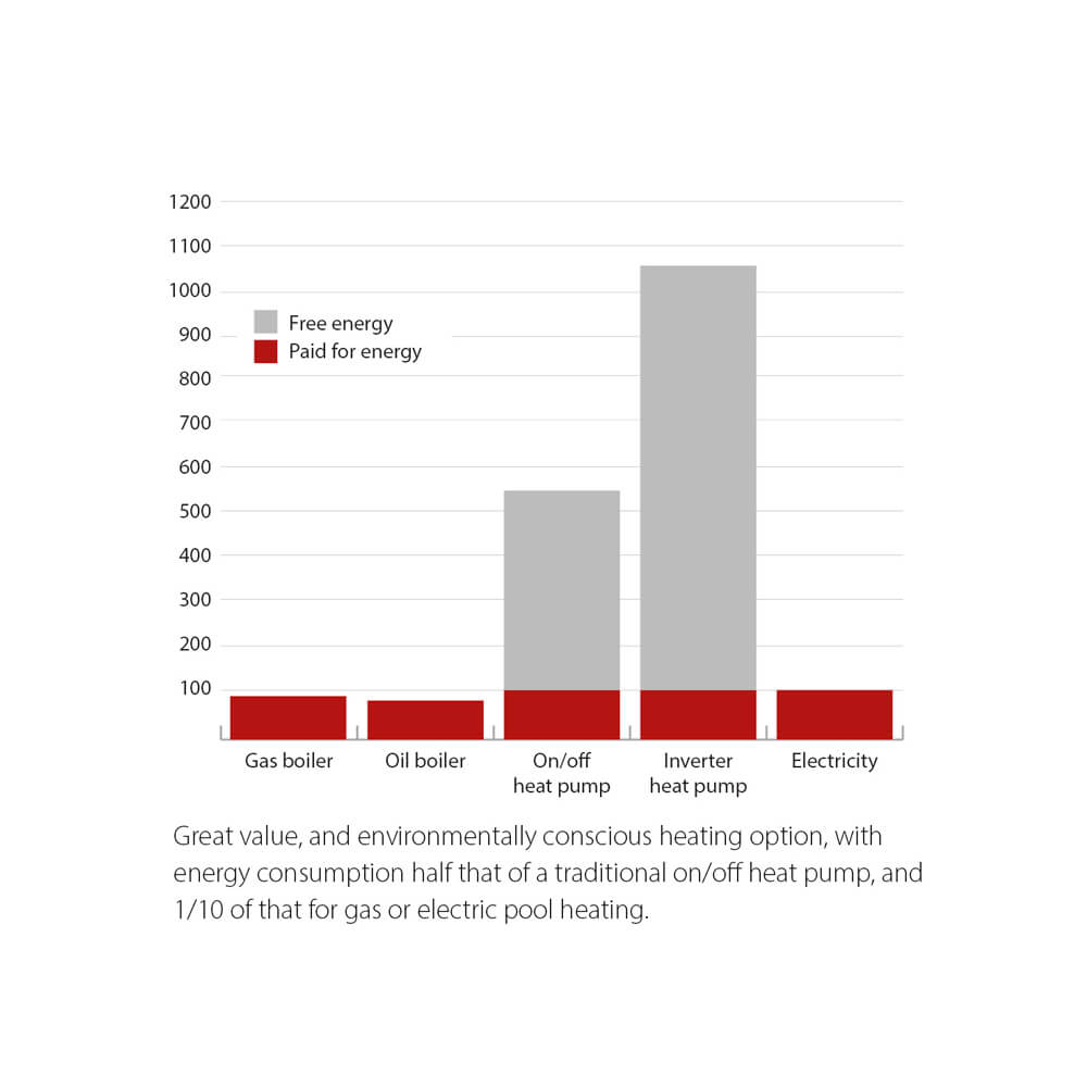 La technologie Inverter permet de moduler la puissance restituée, afin de ne consommer que la quantité d'énergie nécessaire. Les performances sont optimisées par rapport aux pompes traditionnelles (COP moyen de 9,7), et le niveau sonore est considérablement réduit.