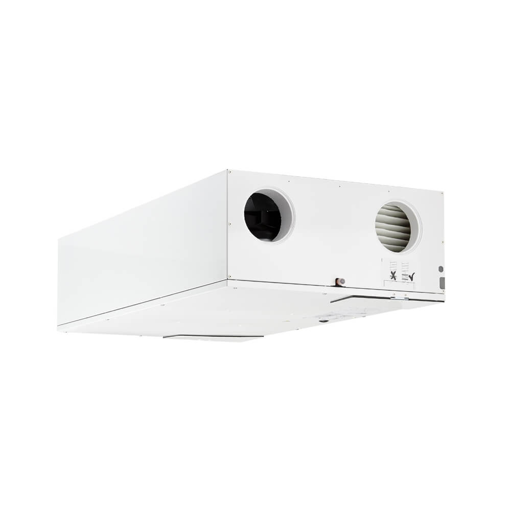 L'unité HCC 2 est une solution de ventilation résidentielle unique et flexible. Avec seulement 30 cm de hauteur d'installation, elle est idéale pour une installation dans des plafonds suspendus ou sur un mur, même caché dans une armoire. Il est possible d'inverser ce dispositif électroniquement, ce qui implique que les deux flux d'air sont inversés. Cela permet d'installer le même type de dispositif avec les gaines intérieures/extérieures raccordées à droite ou à gauche du dispositif. Il est également possible d'effectuer les raccords électriques à gauche ou à droite.