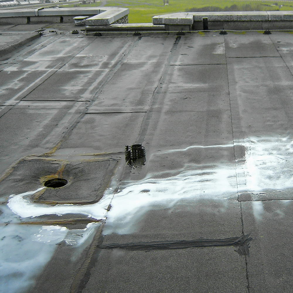 Luminat convient particulièrement bien aux contrôles d'étanchéité sur les niveaux d'eau des toits plats ou au contrôle des bouches d'égout et des tuyaux de descente. À ses points de sortie, la substance fluorescente peut être détectée et rendue visible sous lumière UV.