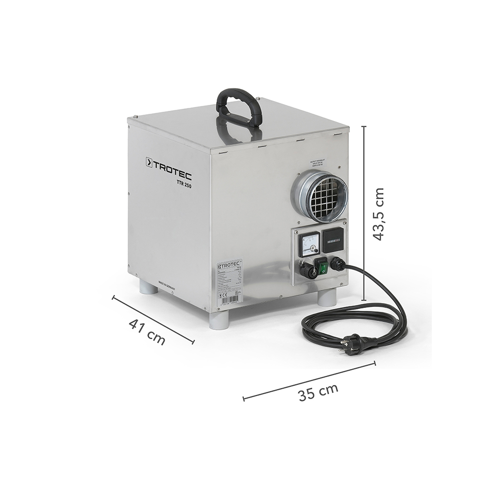 Le déshumidificateur à adsorption TTR 250 assure une déshumidification élevée, même à des points de rosée bas et sa carrosserie est résistante à la corrosion. Idéal pour la production, le stockage et les environnements sensibles à l'humidité, il répond aux normes d'hygiène les plus strictes. Fabriqué par Trotec en Allemagne, le TTR 250 bénéficie d'une qualité professionnelle. Ses dimensions compactes de 350 x 410 x 435 mm permettent un empilage peu encombrant, tandis qu'une prise DIN standard permet un contrôle externe. Doté d'un rotor à sorption au gel de silice, d'un récupérateur de chaleur, d'un chauffage PTC, etc., c'est un choix polyvalent avec un suivi de la consommation électrique en option.