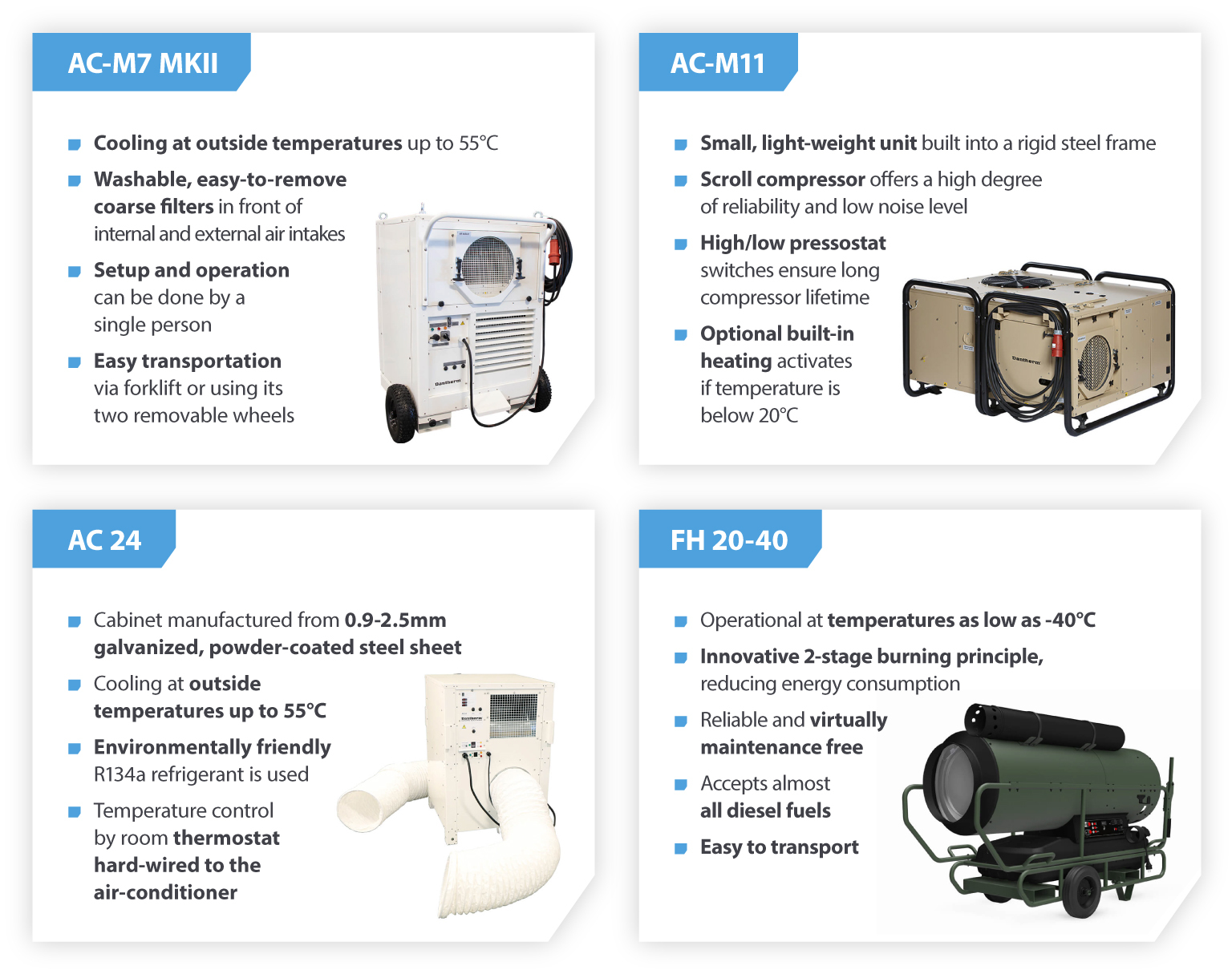 With the speed and urgency in which these camps must be set up, and often in difficult conditions, it is imperative that the climate control solutions used are easy to operate. Especially if the camps will be moving from location to location, any problems starting, using or maintaining these units puts those on-site at the mercy of the outdoor climate.