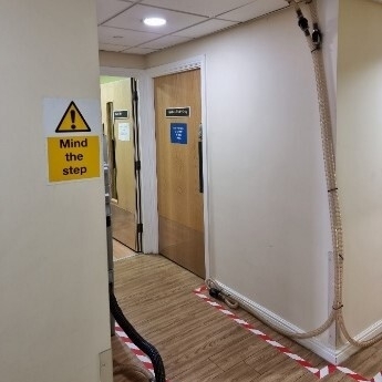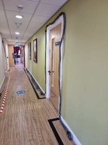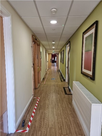The ground floor was divided into two sections, allowing the care home to continue normal operations by relocating some key facilities to unaffected areas like the dining hall. This setup enabled the drying contractor to target approximately 50% of the affected area initially before moving on to the rest of the building.