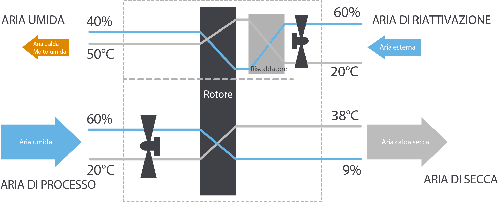 L'altro 25% dell'"aria di rigenerazione" viene riscaldato a circa 120 °C, rimuovendo l'umidità dal rotore. L'aria umida viene rilasciata nell'atmosfera attraverso un condotto, terminando un processo continuo di entrambi i flussi d'aria che passano attraverso il rotore.