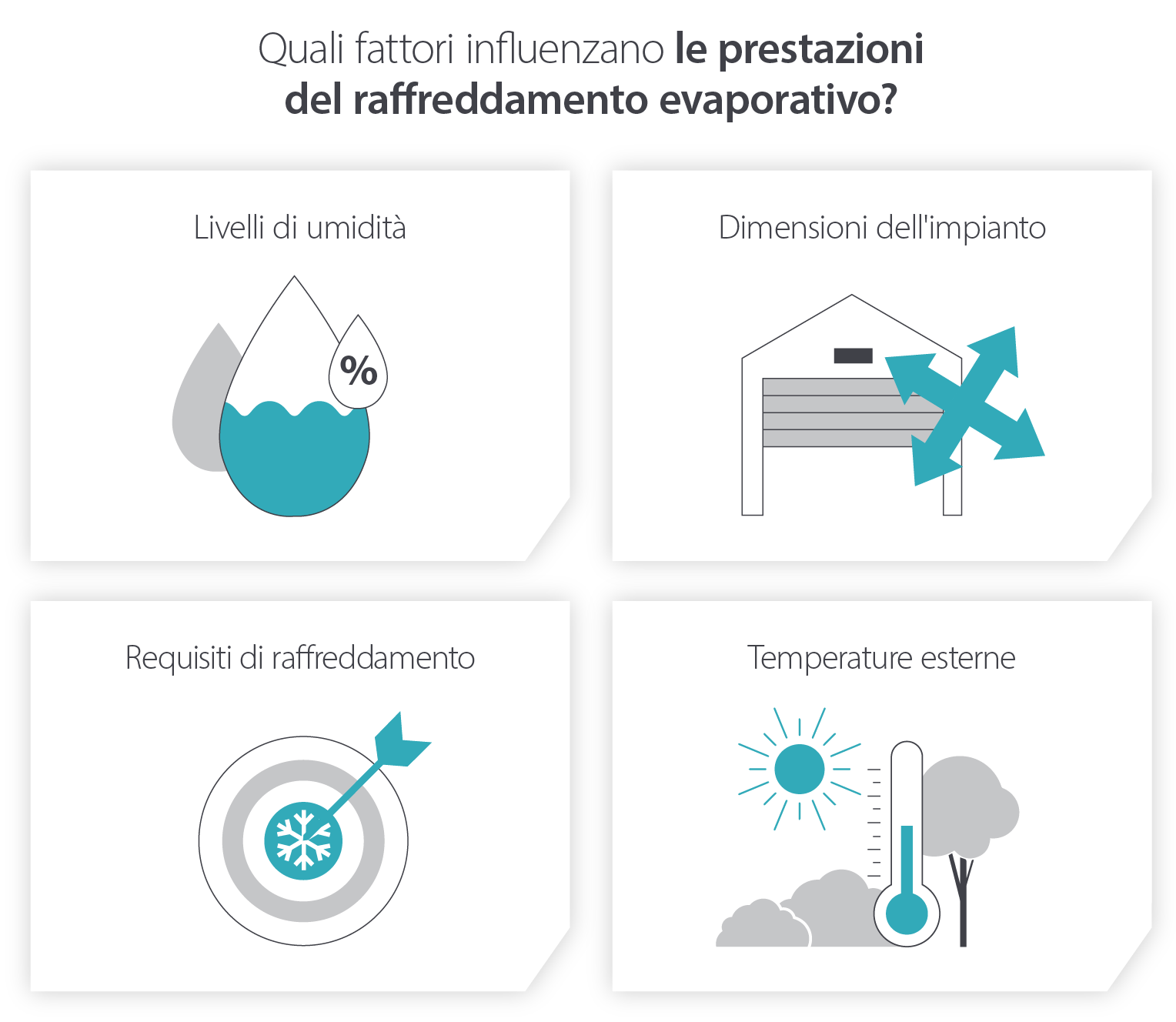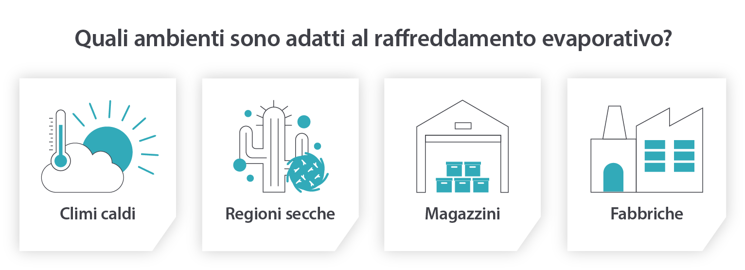 Inoltre, le strutture che non hanno bisogno di mantenere le temperature a un livello preciso e fisso in ogni momento sono più adatte a un raffrescatore evaporativo. Queste unità, infatti, dipendono dalle condizioni atmosferiche esterne per fornire aria fresca e possono variare in base alle condizioni.