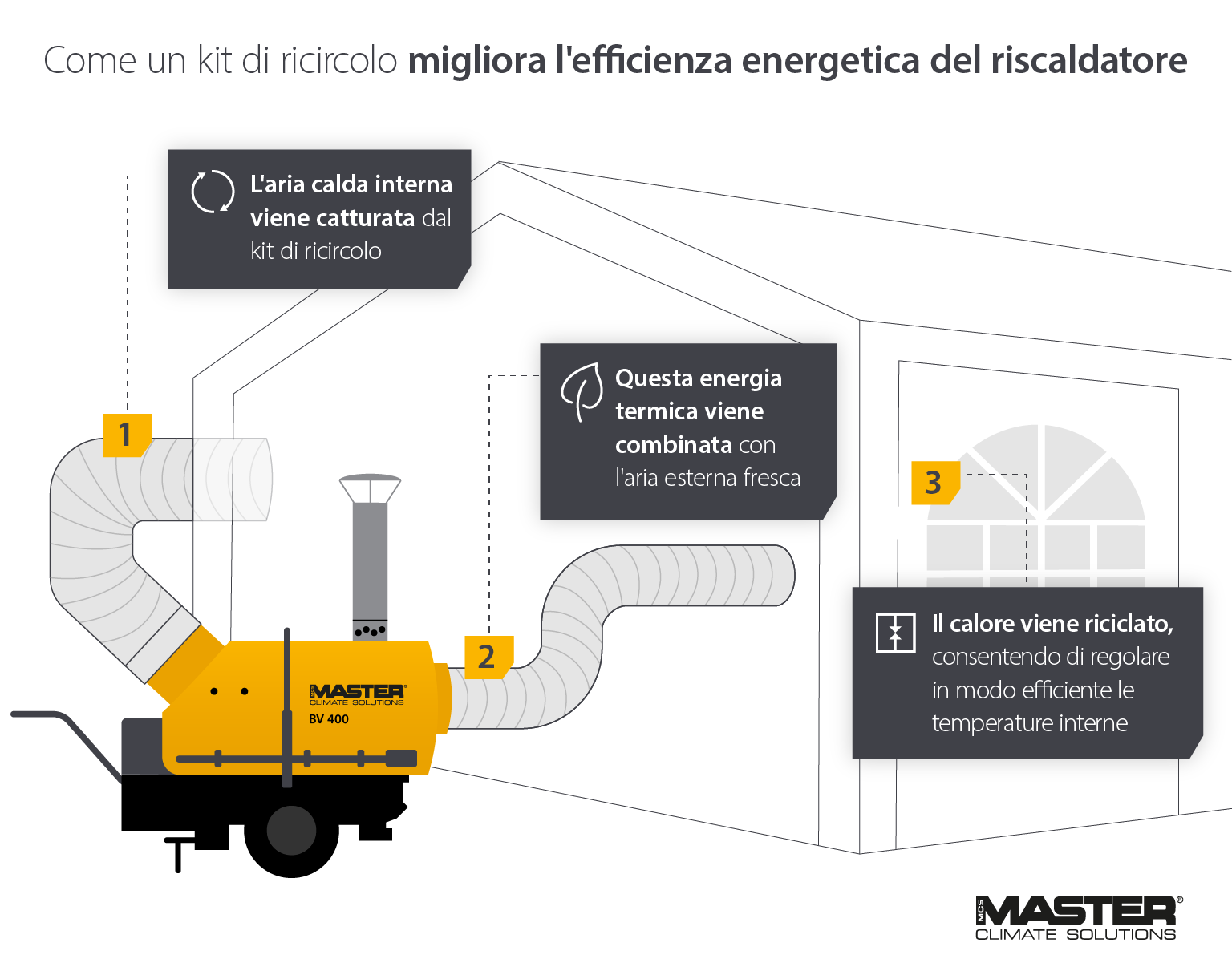 Utilizzato solo con i riscaldatori a fuoco indiretto, il kit di ricircolo è un altro accessorio importante per ottenere la massima efficienza energetica.