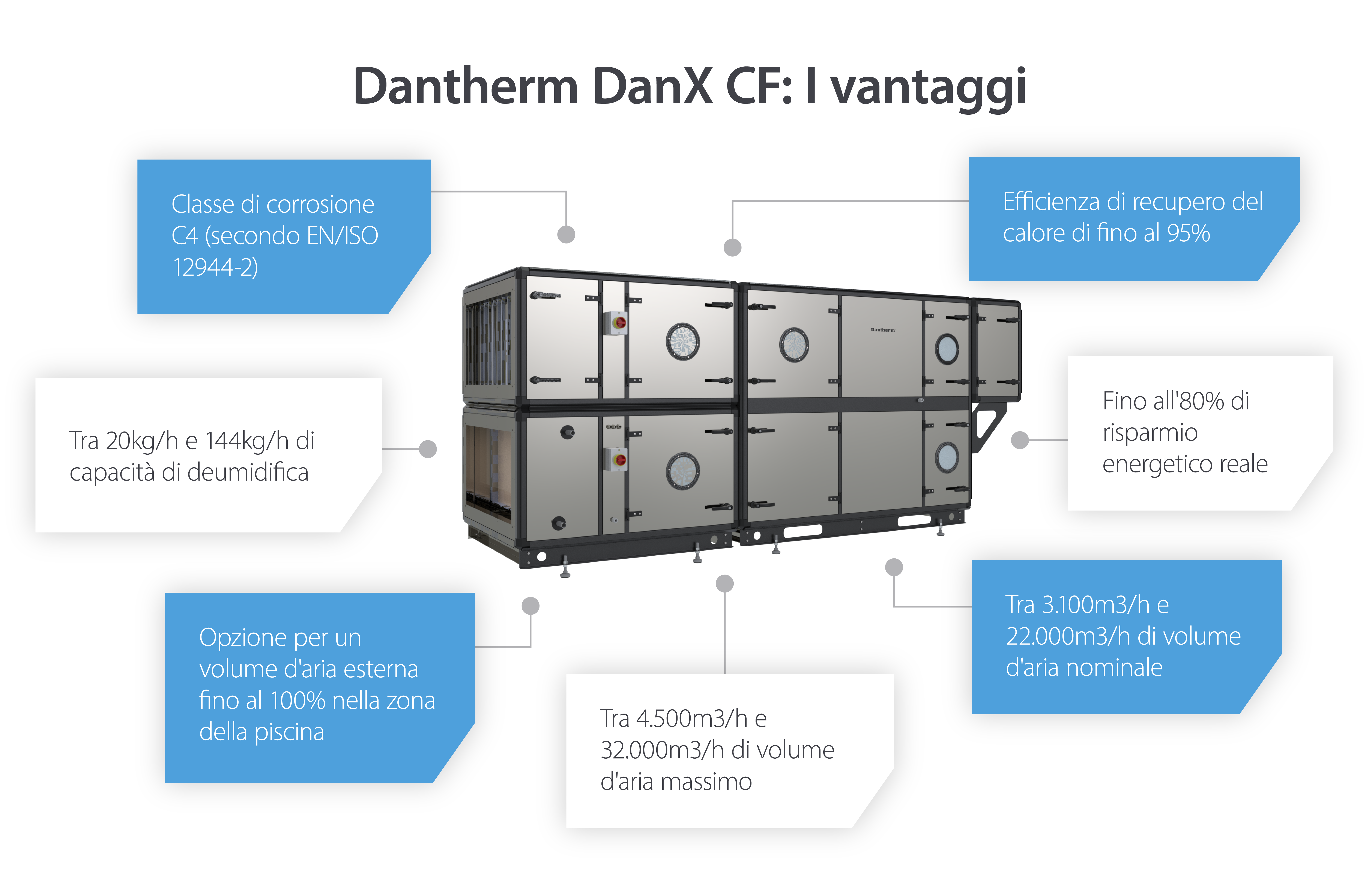 La possibilità di aspirazione di aria fresca al 100% rende la gamma DanX CF appropriata anche per piscine terapeutiche e piscine in hotel o spa, così come per piscine commerciali pubbliche.