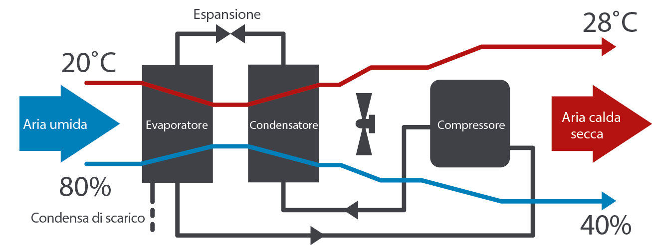 L'aria raffreddata passa attraverso il condensatore e viene riscaldata nuovamente