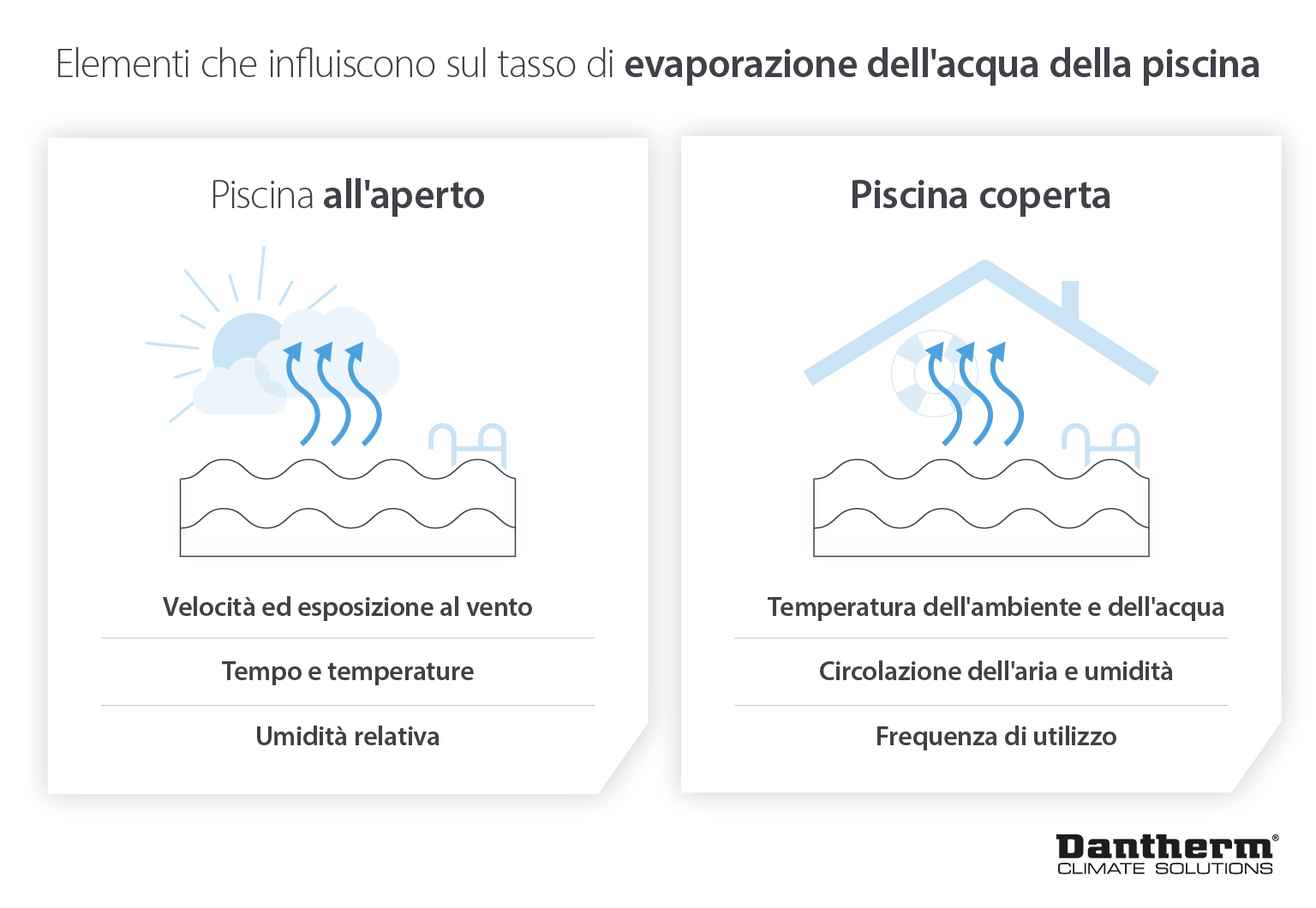 Questo è uno dei principali fattori che influisce sulla potenza necessaria per riscaldare la piscina, poiché le nostre ricerche indicano che l'80%-90% dell'energia termica viene utilizzata solo per reintegrare il calore perso a causa dell'evaporazione.