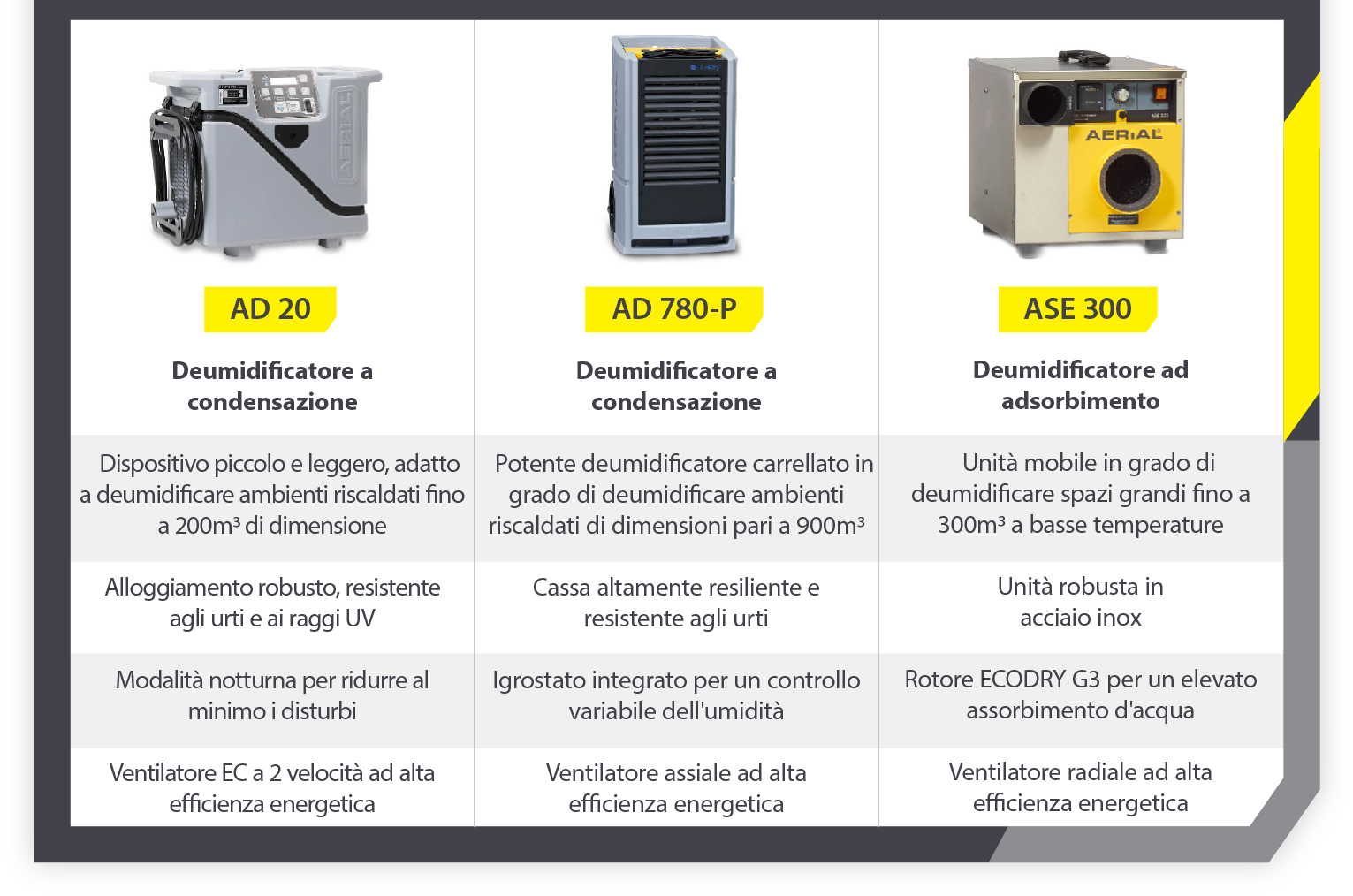Per catturare l'umidità, l'aria umida viene aspirata nell'unità. L'aria viene raffreddata, l'acqua viene condensata dal flusso d'aria e quindi scaricata, mantenendo l'umidità negli ambienti interni.