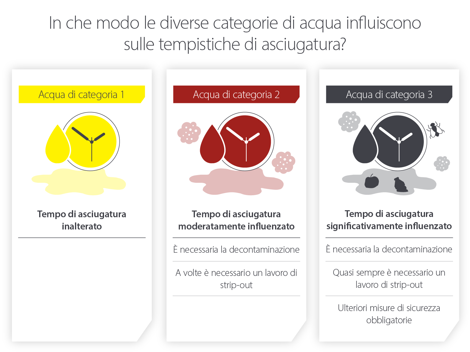 Anche la categoria dell'acqua presente all'interno di una proprietà, definita dall'Institute of Inspection Cleaning and Restoration Certification (IICRC), può influenzare il tipo di danno idrico subito da un edificio e il tempo necessario per gestirlo.