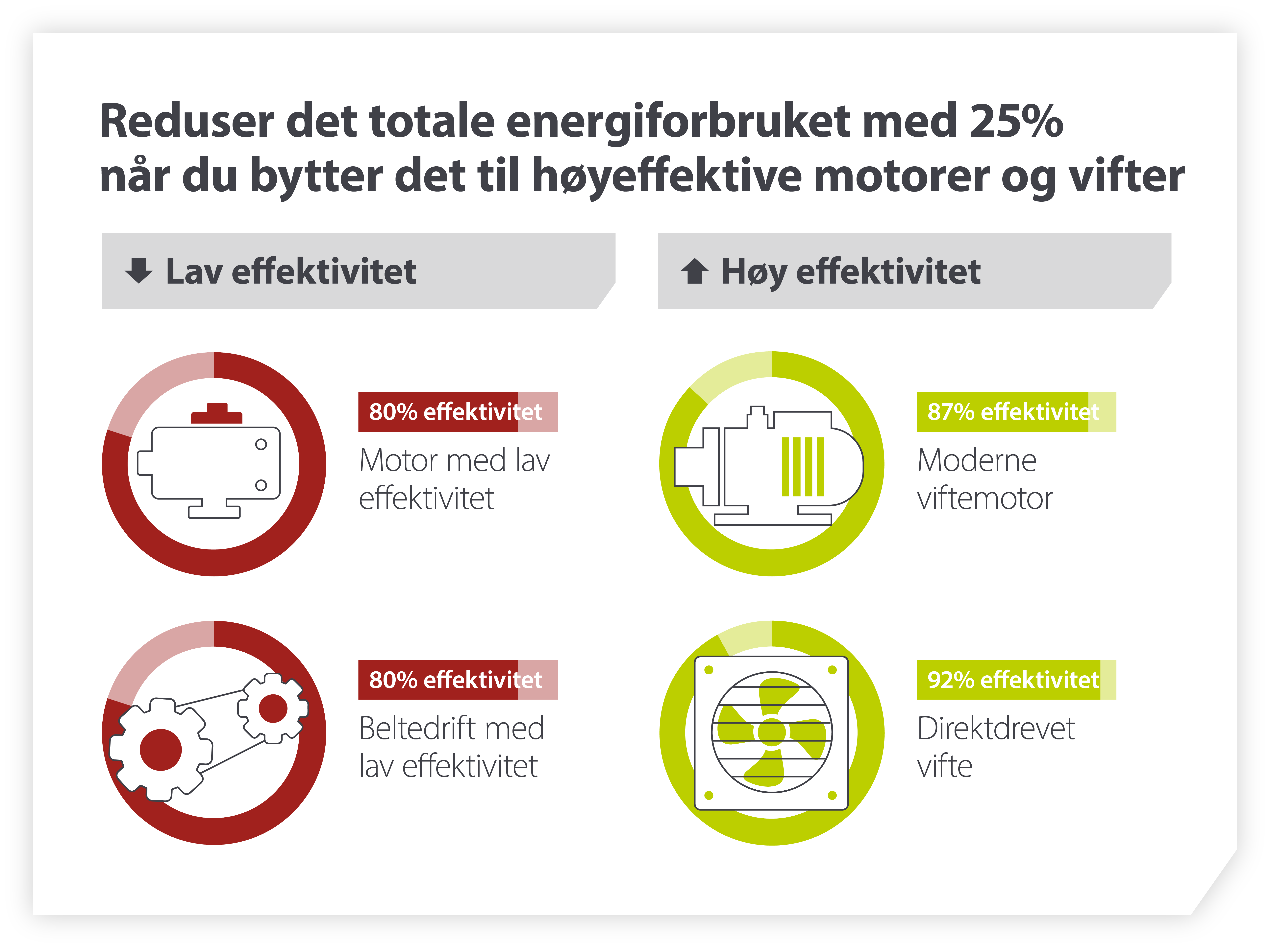 Tenk på følgende, spesielt hvis du har et gammelt aggregat – bruk av en laveffektiv motor (80 % effektivitet) og reimdrift (80 % effektivitet), sammenlignet med en normal viftemotor (87 %) og direktedrevne vifter (92 %) kan føre til opptil 25 % økning i det totale energiforbruket.