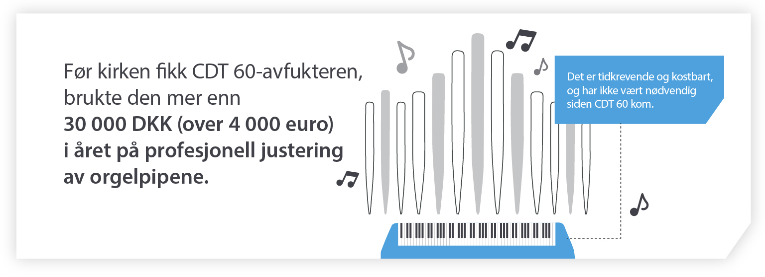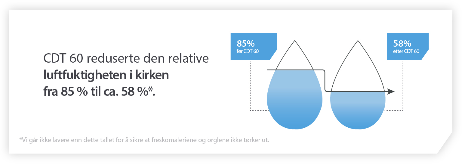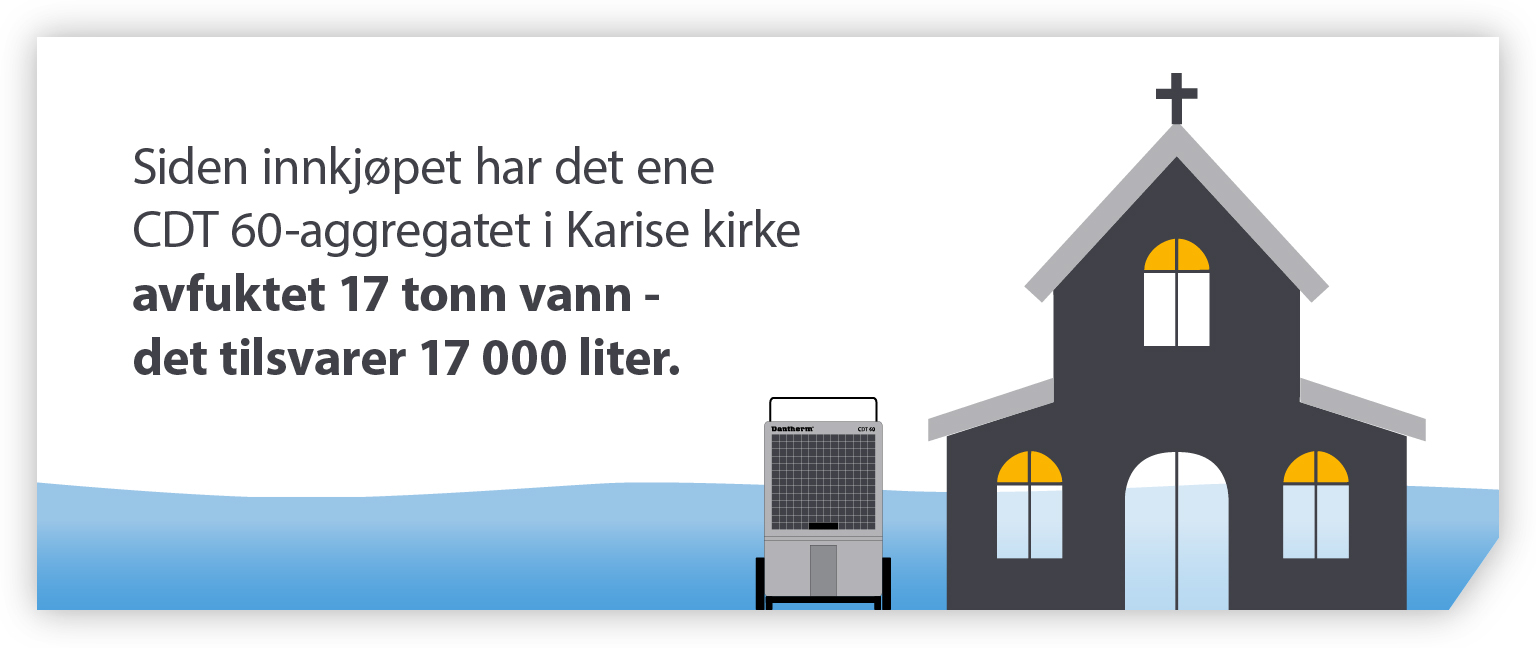 Når en kirke opplever fuktskader, kan restaurering av den koste drøye 40 millioner NOK (over €4 millioner). Avfukting bidrar til å forbedre inneklimaet radikalt, regulere relative fuktighetsnivåer og hindre at fuktigheten skader verdifulle gjenstander og materialer.