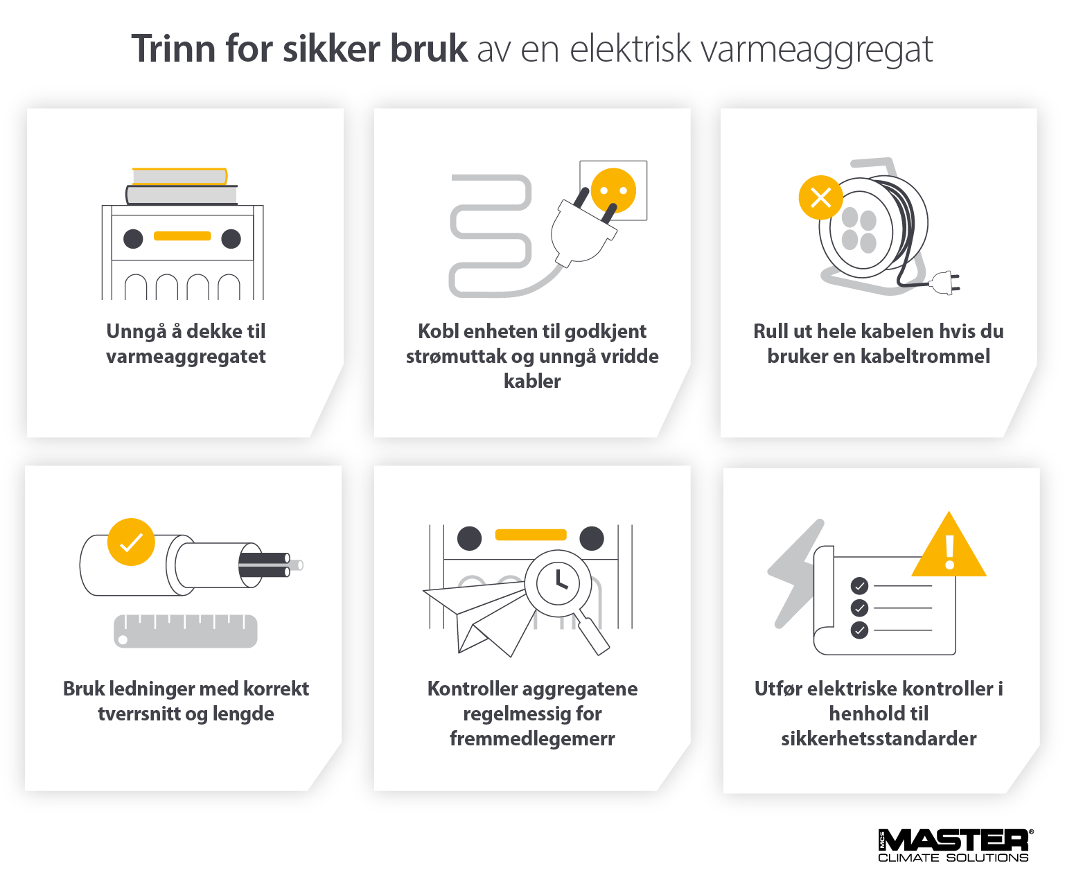 Elektriske varmluftsaggregater er eksepsjonelt sikre. Men for å maksimere sikkerheten til de som arbeider eller oppholder seg på disse stedene, er det viktig å lese bruksanvisningen som følger med enheten.