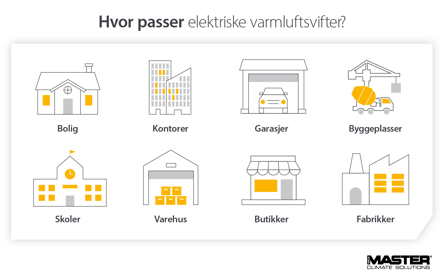 Elektriske viftevarmere er svært allsidige og robuste, fra oppvarming av klasserom og behandling av epoksy på skipsverft til tørking av gips på byggeplasser og gjenoppretting av vannskadede eiendommer.