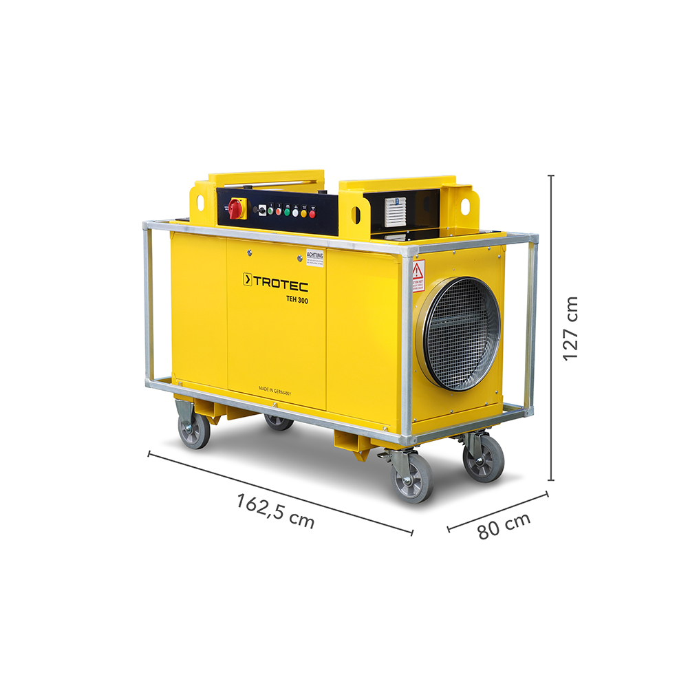Det elektriske varmeapparatet TEH 300 er en ekstremt robust og slitesterk varmeløsning som egner seg perfekt til store industrielle applikasjoner. TEH 300 er utstyrt med en 8-trinns elektronisk bryter for luftmengde og temperatur, og har en varmekapasitet på opptil 80 kW. Aggregatet leveres som standard med støtsikker ramme, kranføtter, gaffeltruckspor og praktiske transporthjul. Den kan også leveres med overopphetingsbeskyttelse.